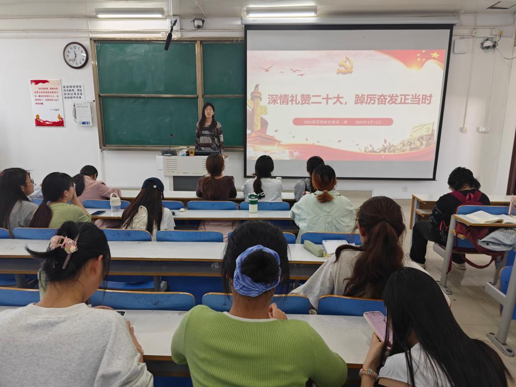 为进一步宣传二十大精神,保证同学们紧跟党的路线、方针、政策,4月11日上午,2023级思想政治教育二班在社科楼515教室开展“深情礼赞二十大,踔厉奋发正当时”主题团课。本次团课由团支书王慜初主持,全体二班同学参加。