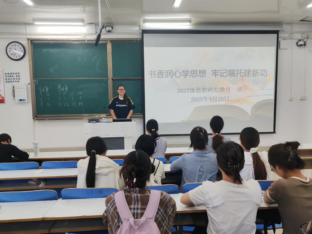班会伊始,张卓阐述了本次班会召开的重要意义,鼓励同学们通过阅读经典、交流感悟,深刻领会党的精神内涵,积极投身新时代建设。随后,进入读书分享环节,同学们纷纷拿出自己研读的党的理论著作、红色经典书籍。张姗姗分享了阅读《习近平新时代中国特色社会主义思想学习纲要》的心得,结合校园生活实际,讲述如何运用新思想解决学习和生活中的难题,倡导大家从身边小事做起,践行党的理念。刘一涵则分享了阅读红色小说《红岩》的感悟,表示要传承红色基因,在新时代勇于担当作为。最后,张卓对本次班会进行总结,强调同学们要持续学习党的先进思想,把学习成果转化为学习动力和社会实践,在新时代牢记嘱托,努力成长为有理想、敢担当、能吃苦、肯奋斗的新时代好青年。
