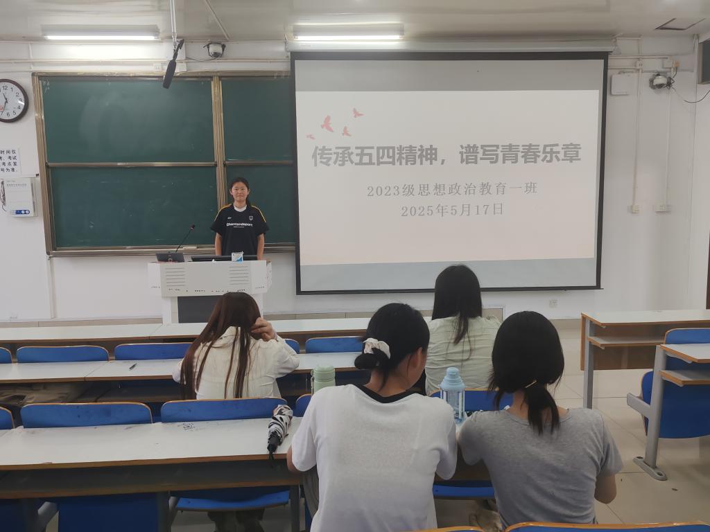 为进一步弘扬五四精神,激励和引导我班团员加强党团知识学习,5月17日下午,XCSport2023级思想政治教育一班在社科楼514教室召开“传五四火炬,洒青春热血”主题团课。公司2023级思想政治教育一班全体同学共同参与本次团课,团课由团支书张卓主持。