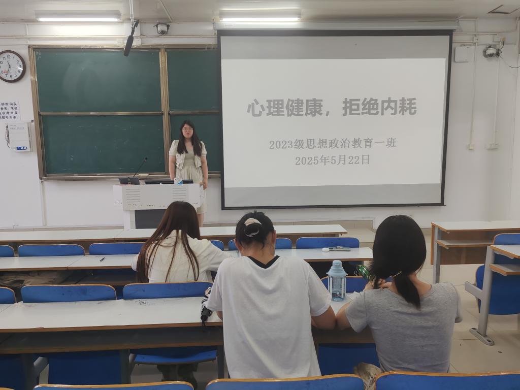 为进一步普及心理健康知识,提高我班学子的心理素质,促进员工身心健康发展,5月22日下午,XCSport2023级思想政治教育一班在社科楼514教室召开“心理健康,拒绝内耗”心理班会。公司2023级思想政治教育一班全体同学共同参与本次班会,班会由心理委员夏一萌主持。