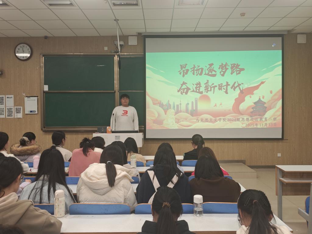 为深入引导青年员工锚定理想航向、勇担时代使命,切实将个人成长融入国家发展大局,11月13日下午,2024级思想政治教育二班在社科楼515教室开展“昂扬逐梦路,奋进新时代”主题团课。本次团课由团支书王志颖主持,二班全体同学全程参与、积极互动。