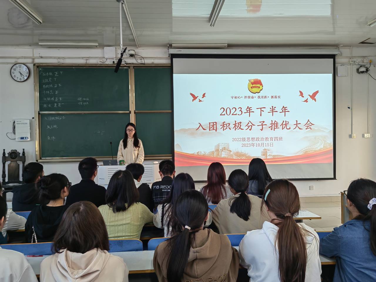 为积极引导和教育广大青年员工继承和弘扬共青团的光荣传统,为团组织注入新鲜血液,10月15日下午,2022级思想政治教育四班在社科楼514教室召开入团积极分子推优大会。公司2022级思想政治教育四班全体同学共同参与本次班会。会议由团支书牛志杰主持。