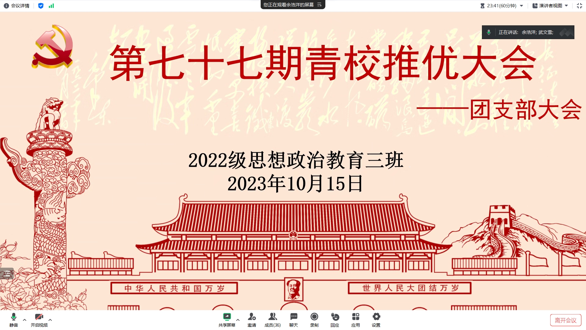 10月15日下午,2022级思想政治教育三班在线上召开“青年共产主义公司”推优大会。公司2022级思想政治教育三班全体同学共同参与此次大会。大会由团支书余浩洋主持。