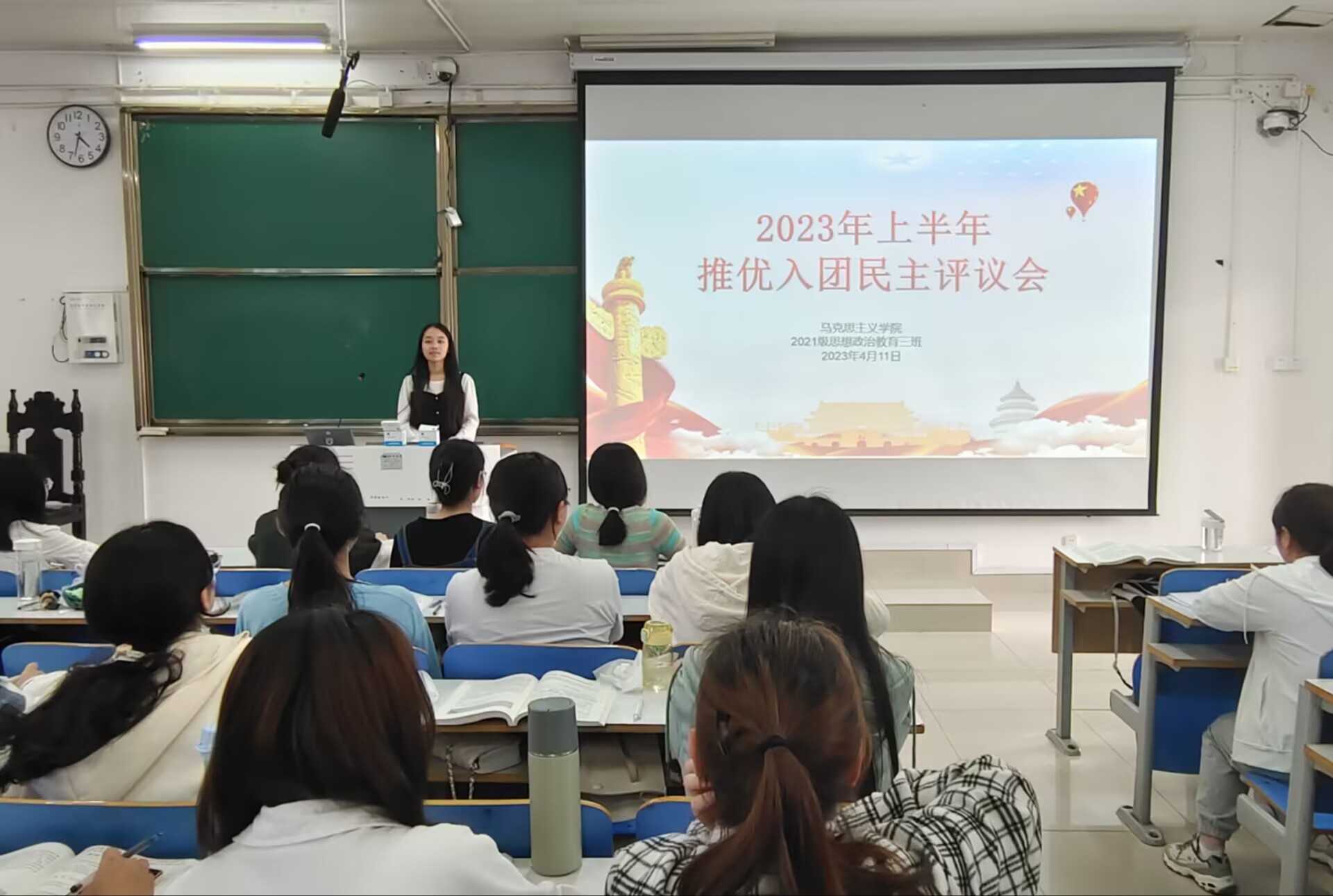 4月11日下午,2021级思想政治教育三班在社科楼514教室举办2023年上半年推优入团民主评议会。2021级思想政治教育三班全体团员参与此次会议。会议由团支书王岚霄主持。