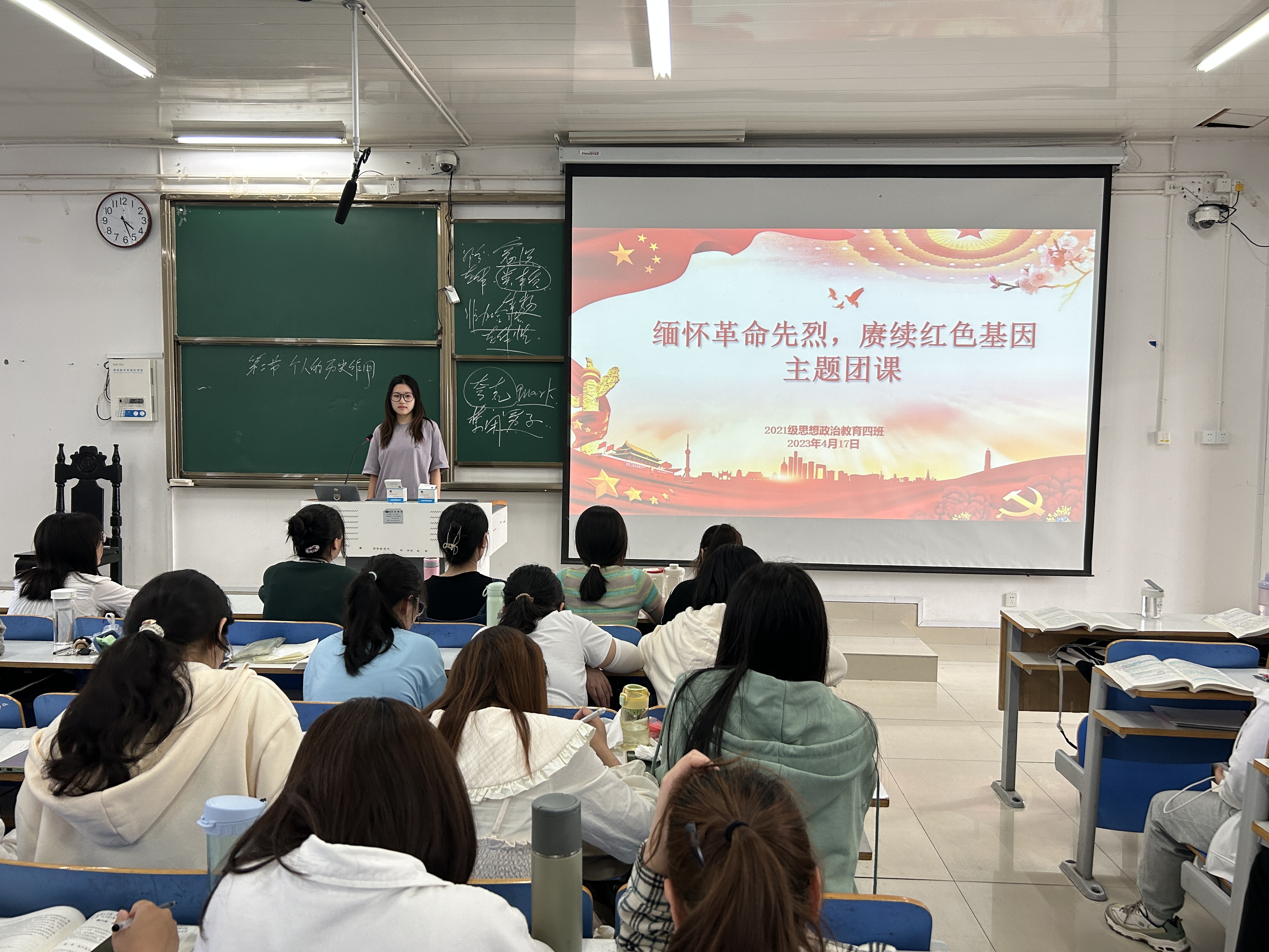 为表达对革命先烈们付出的崇敬和尊重,传承中华民族精神,4月17日下午,2021级思想政治教育四班在社科楼514教室开展“缅怀革命先烈,传承红色基因”主题团课。2021级思想政治教育四班全体团员参加本次团课。团课由团支书刘珂含主持。