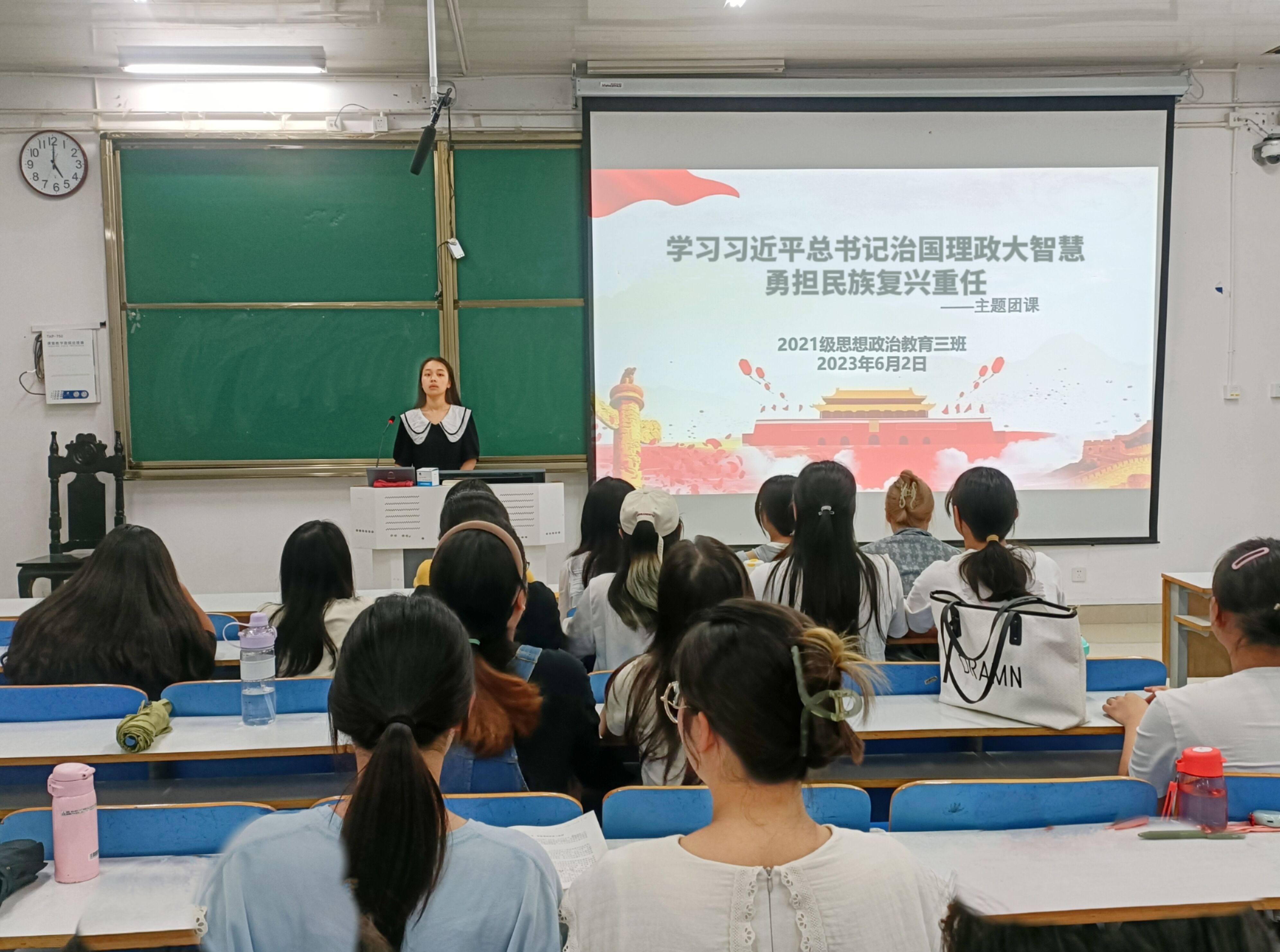 6月2日下午,2021级思想政治教育三班在社科楼514教室召开“学习习近平总书记治国理政大智慧,勇担民族复兴重任”主题团课。2021级思想政治教育三班全体团员参与此次会议。会议由团支书王岚霄主持。