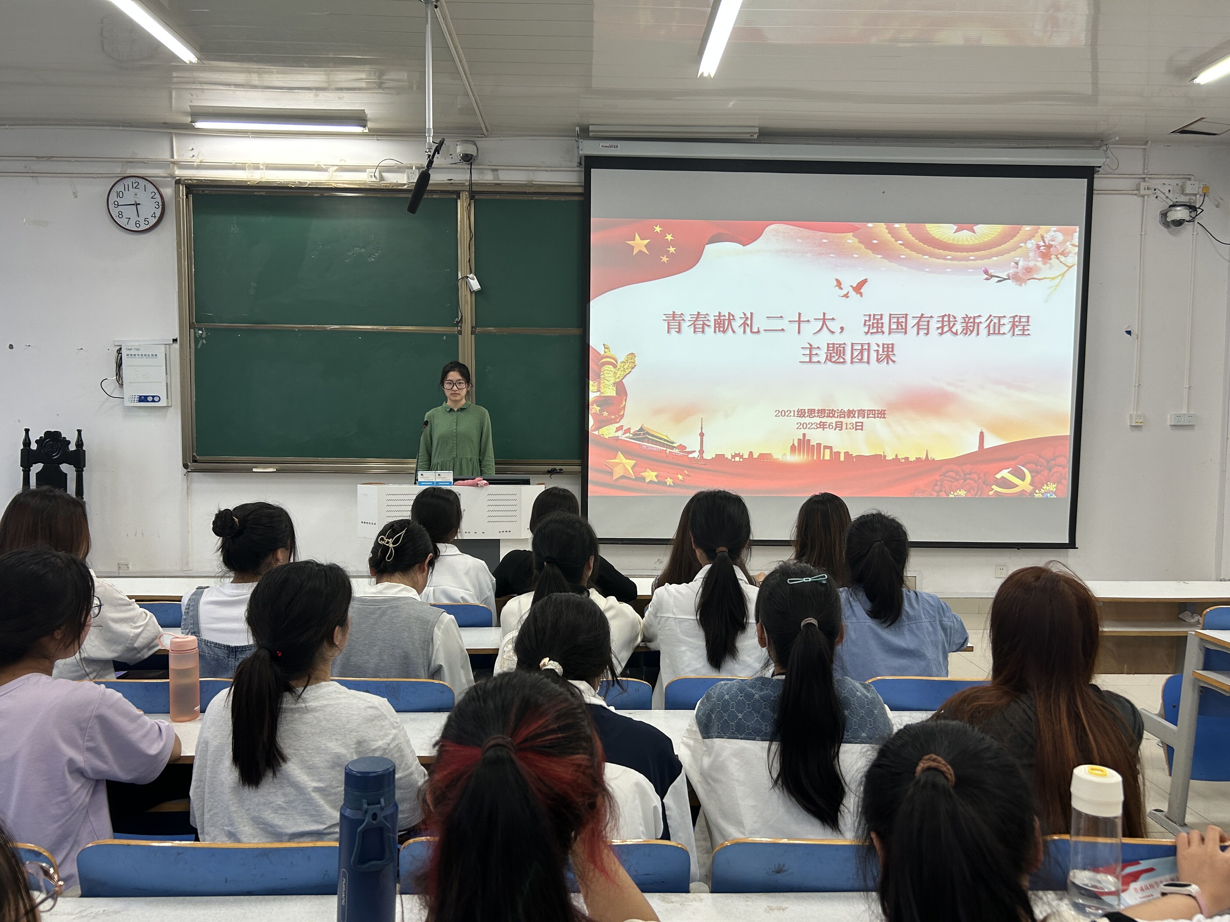为深入贯彻学习党的二十大精神,6月13日下午,2021级思想政治教育四班在社科楼514教室开展“青春献礼二十大,强国有我新征程”主题团课。2021级思想政治教育四班全体团员参加本次团课。团课由团支书刘珂含主持。