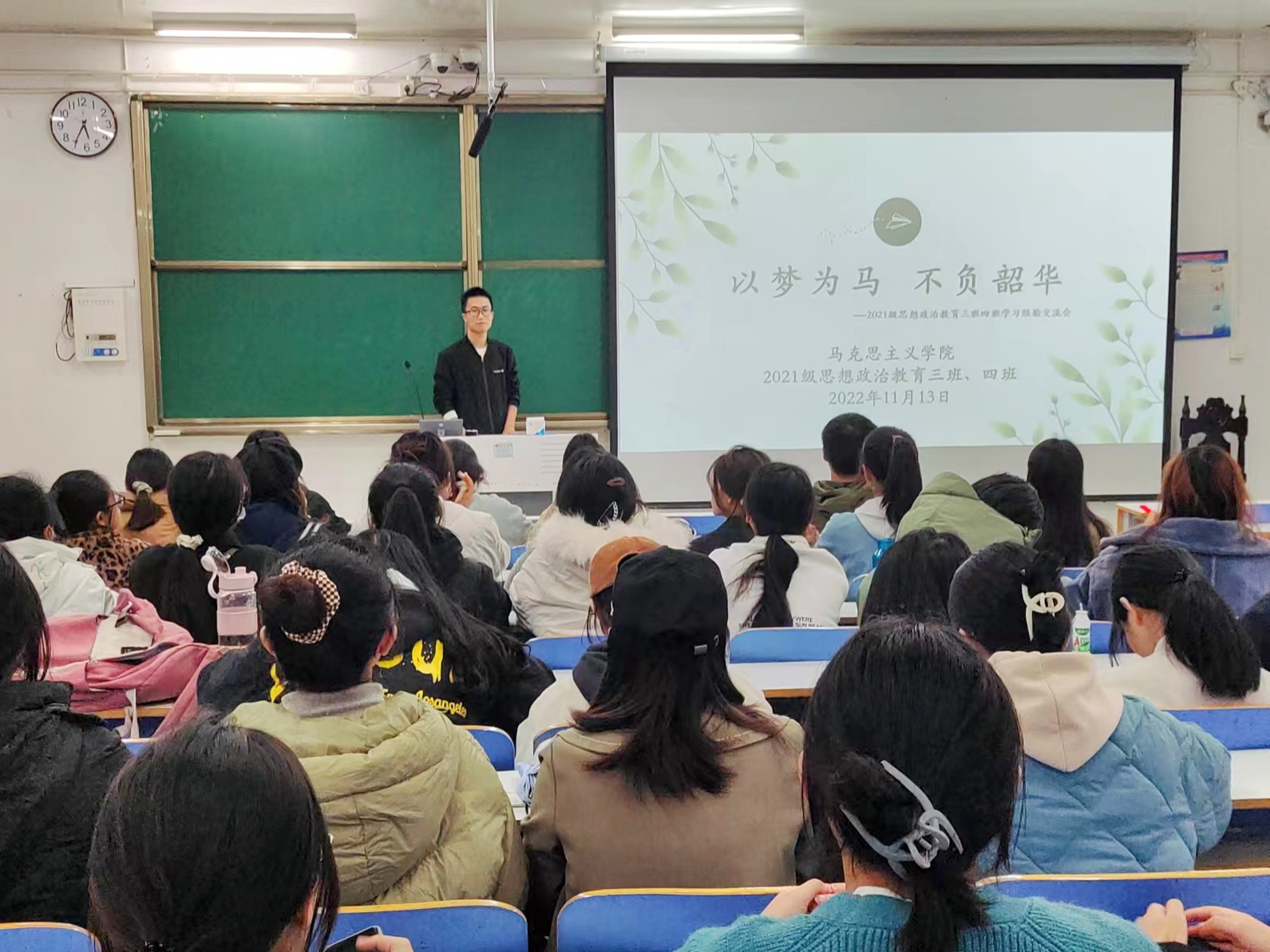 11月13日下午,2021级思想政治教育三班、四班在社科楼514召开“以梦为马,不负韶华”学习经验交流会。2021级思想政治教育三班全体成员以及2020级思想政治教育一班申畅畅、2020级思想政治教育二班岳子怡参与此次会议。会议由学习委员于坤鹏主持。