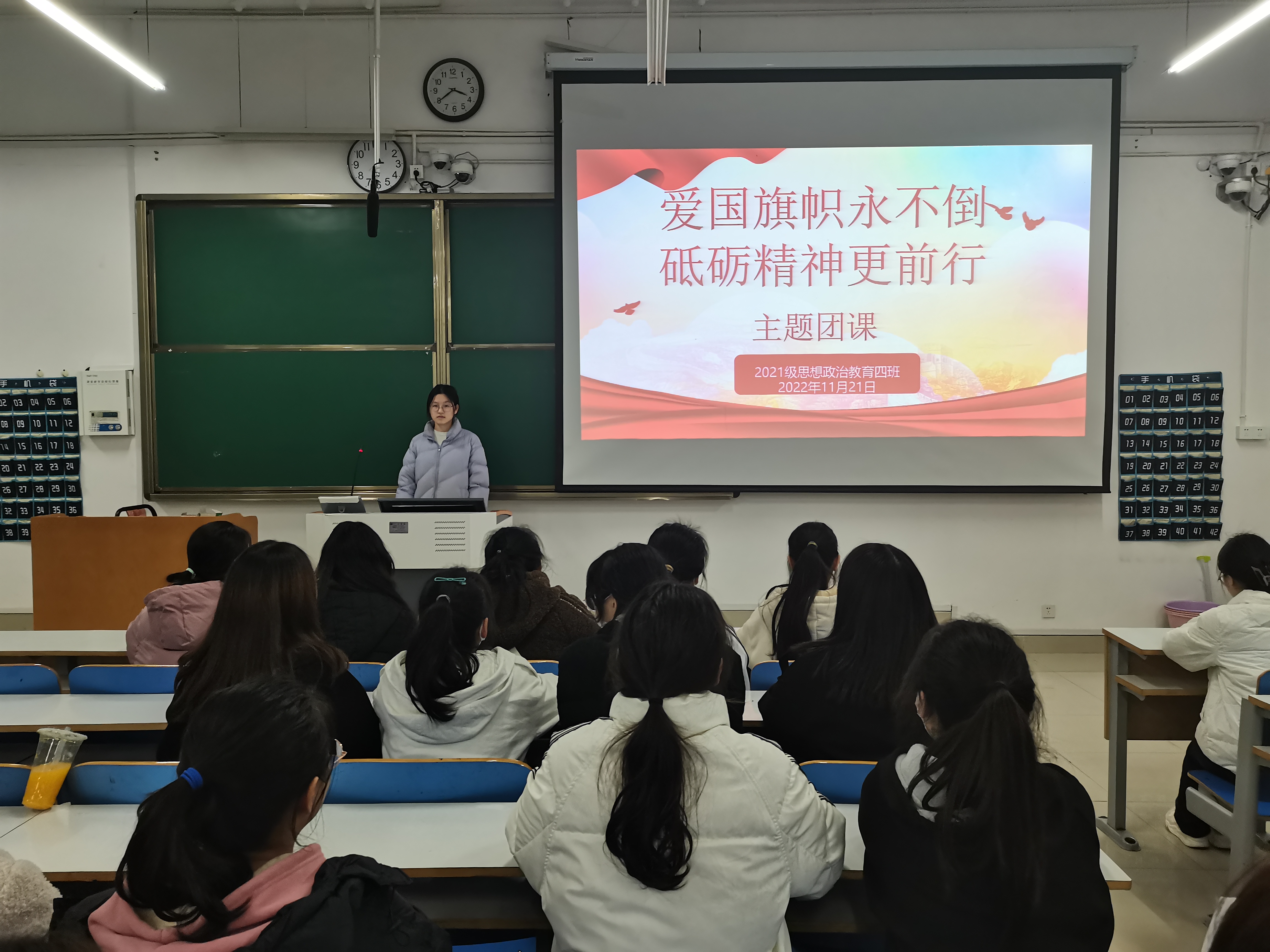 11月21日下午,2021级思想政治教育四班在社科楼514教室开展“爱国旗帜永不倒,砥砺精神更前行”主题团课。2021级思想政治教育四班全体员工共同参加本次团课。团课由团支书刘珂含主持。
