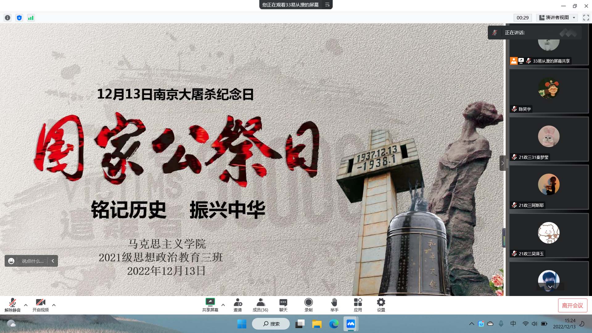 12月13日下午,2021级思想政治教育三班在线上召开“铭记历史,振兴中华”主题班会。2021级思想政治教育三班全体成员参与此次会议。会议由班长易从漫主持。