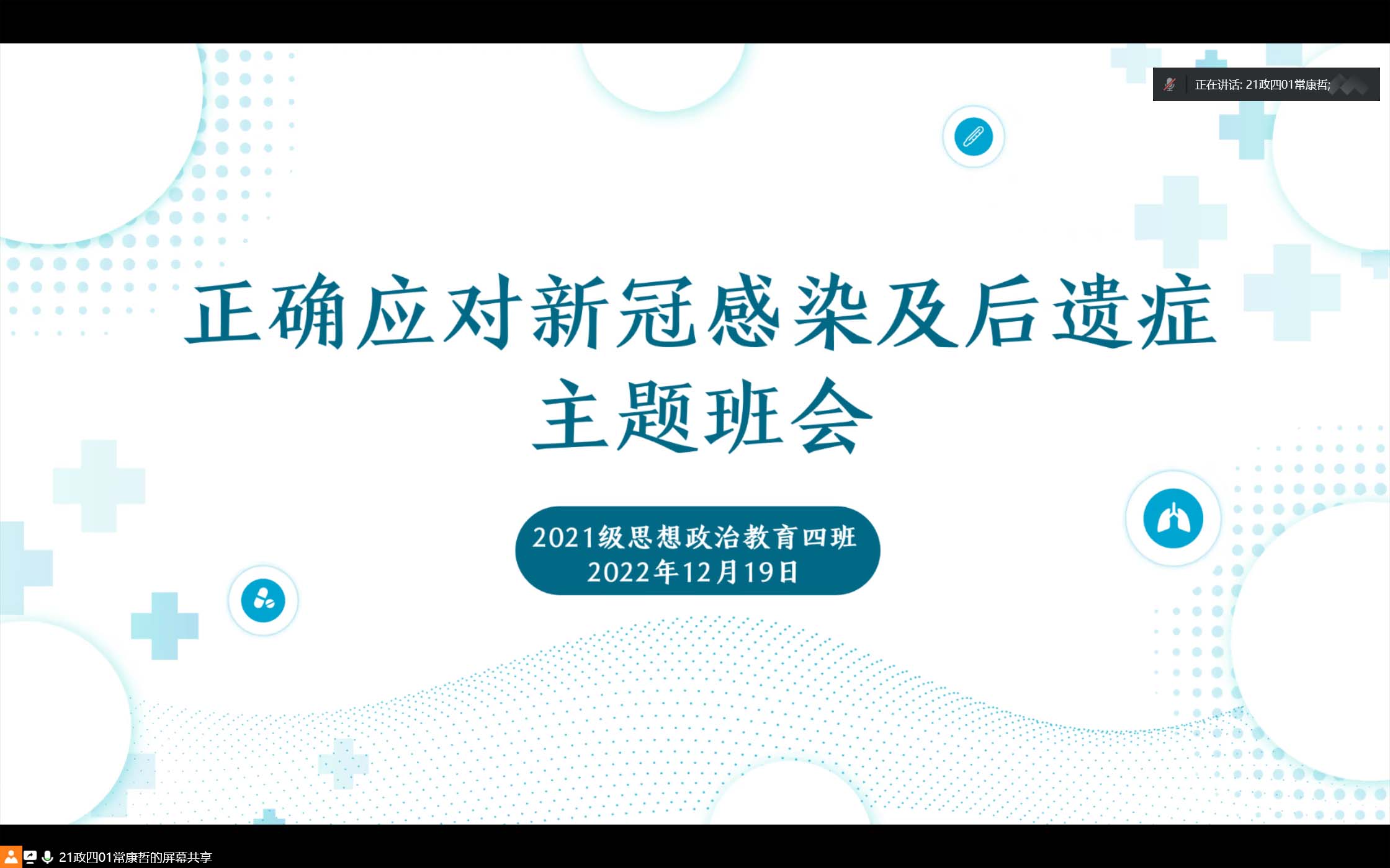 为保障员工及家庭的生命安全和身体健康,增强员工战胜疫情的信心,12月19日下午,2021级思想政治教育四班线上开展“正确应对新冠感染”主题班会。2021级思想政治教育四班全体同学参加本次会议。会议由副班长常康哲主持。