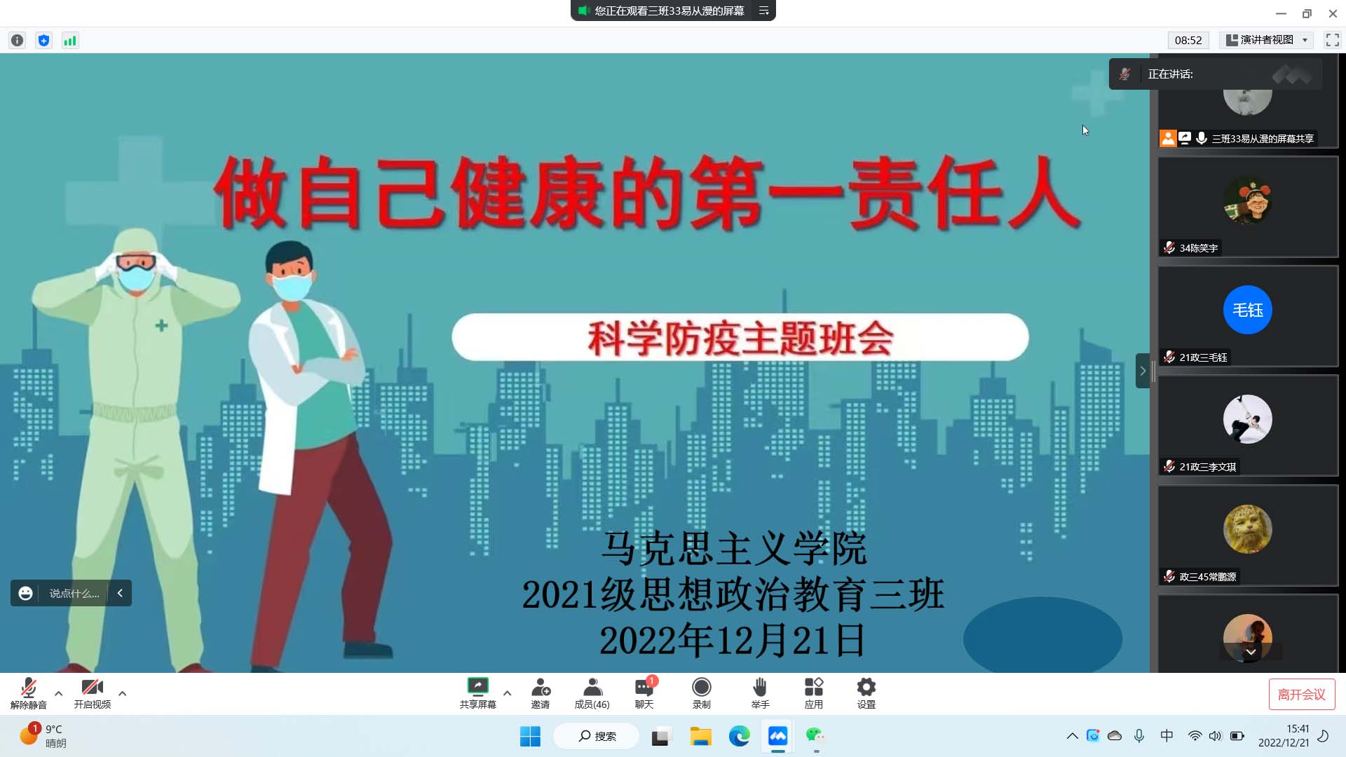 12月21日下午,2021级思想政治教育三班在线上召开“做自己健康的第一责任人”科学防疫主题班会。2021级思想政治教育三班全体成员参与此次会议。会议由班长易从漫主持。