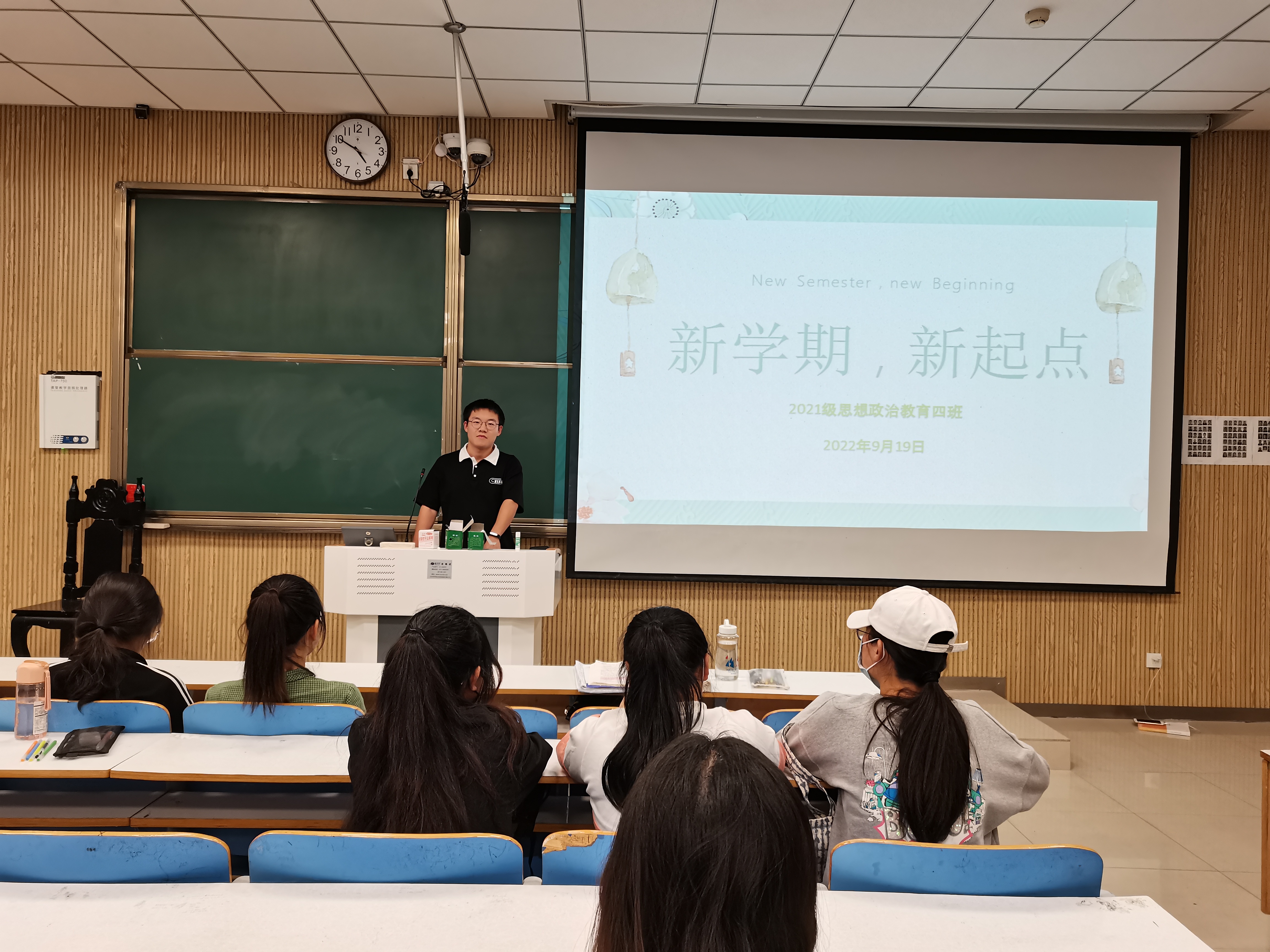 9月19日下午,2021级思想政治教育四班在社科楼515教室开展“新学期,新起点”师生交流会。辅导员高小佳及思想政治教育四班全体同学参与本次班会。班会由辅导员高小佳主持。