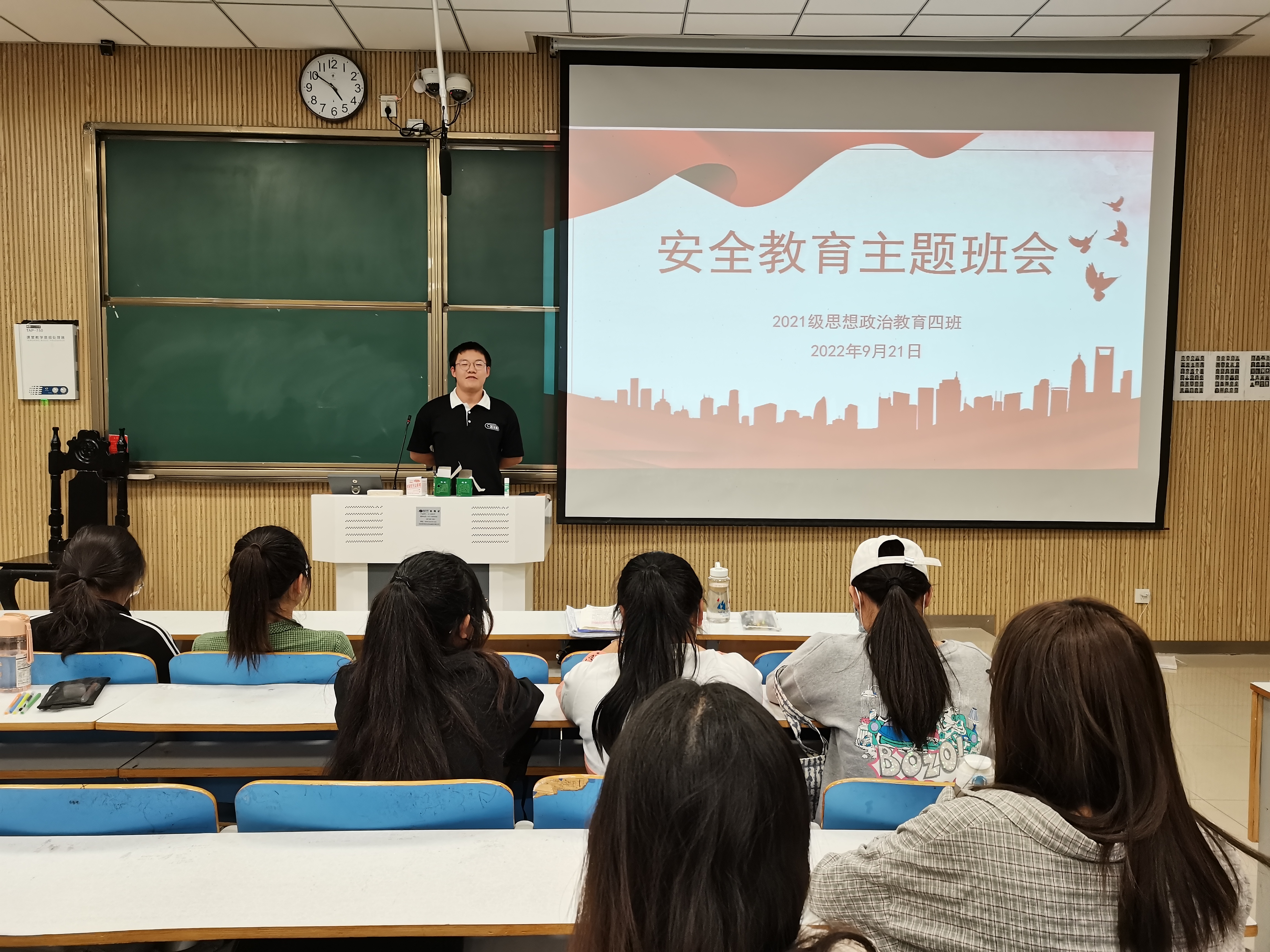9月21日下午,2021级思想政治教育四班在社科楼515教室开展安全教育主题班会。2021级思想政治教育四班全体同学共同参会。班会由副班长常康哲主