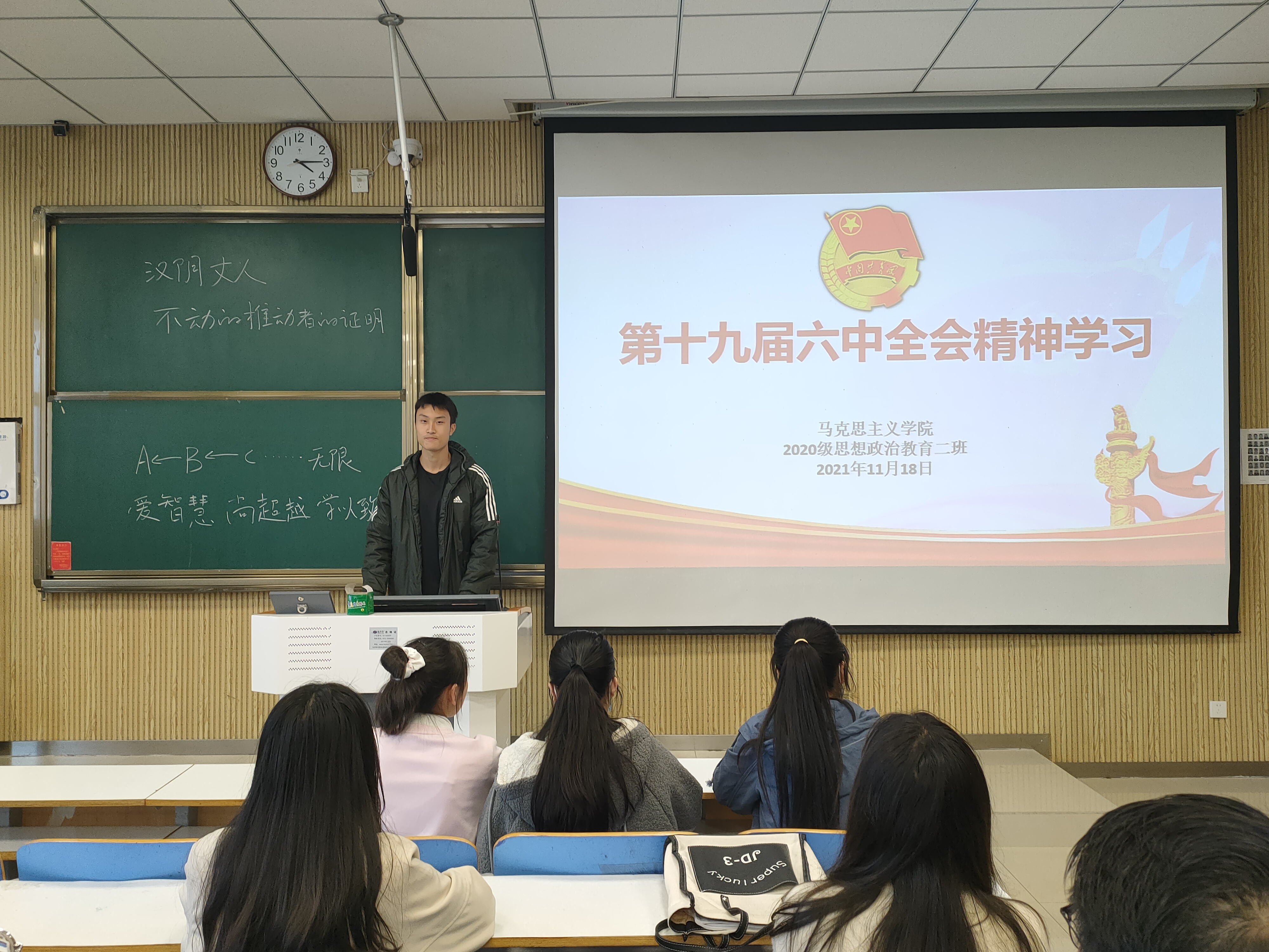 为促使我班团员深入学习党的十九届六中全会精神,回顾党的百年奋斗历程,11月18日下午,2020级思想政治教育二班、定向二班在社科楼515教室召开学习党的十九届六中全会精神主题团课。2020级思想政治教育二班、定向二班全体团员共同参与本次团课。团课由团支书陈宇航主持。