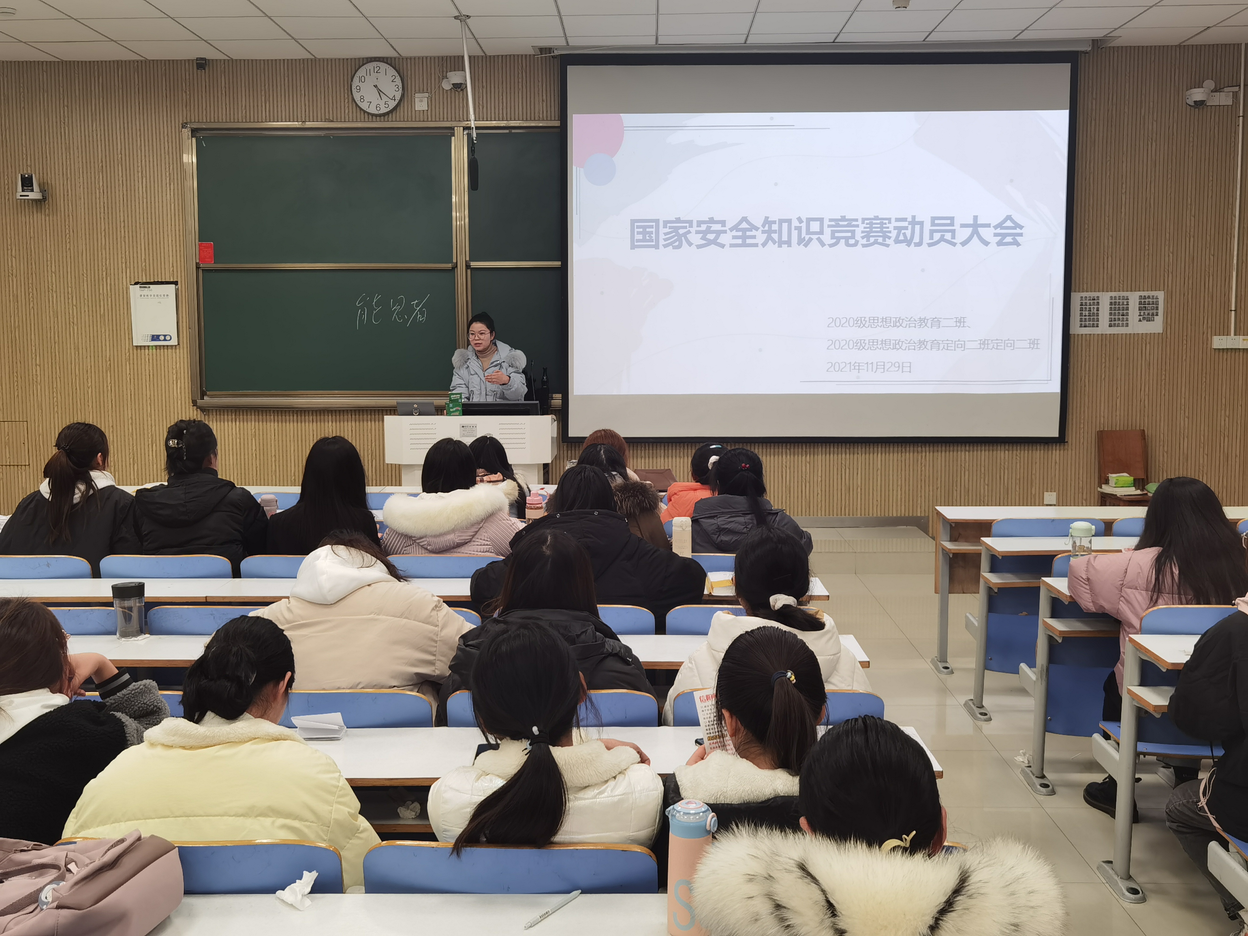 11月29日下午,2020级思想政治教育二班、定向二班在社科楼515教室召开国家安全知识竞赛动员大会。辅导员高小佳、2020级思想政治教育二班、定向二班全体同学共同参与本次大会。会议由高小佳主持。
