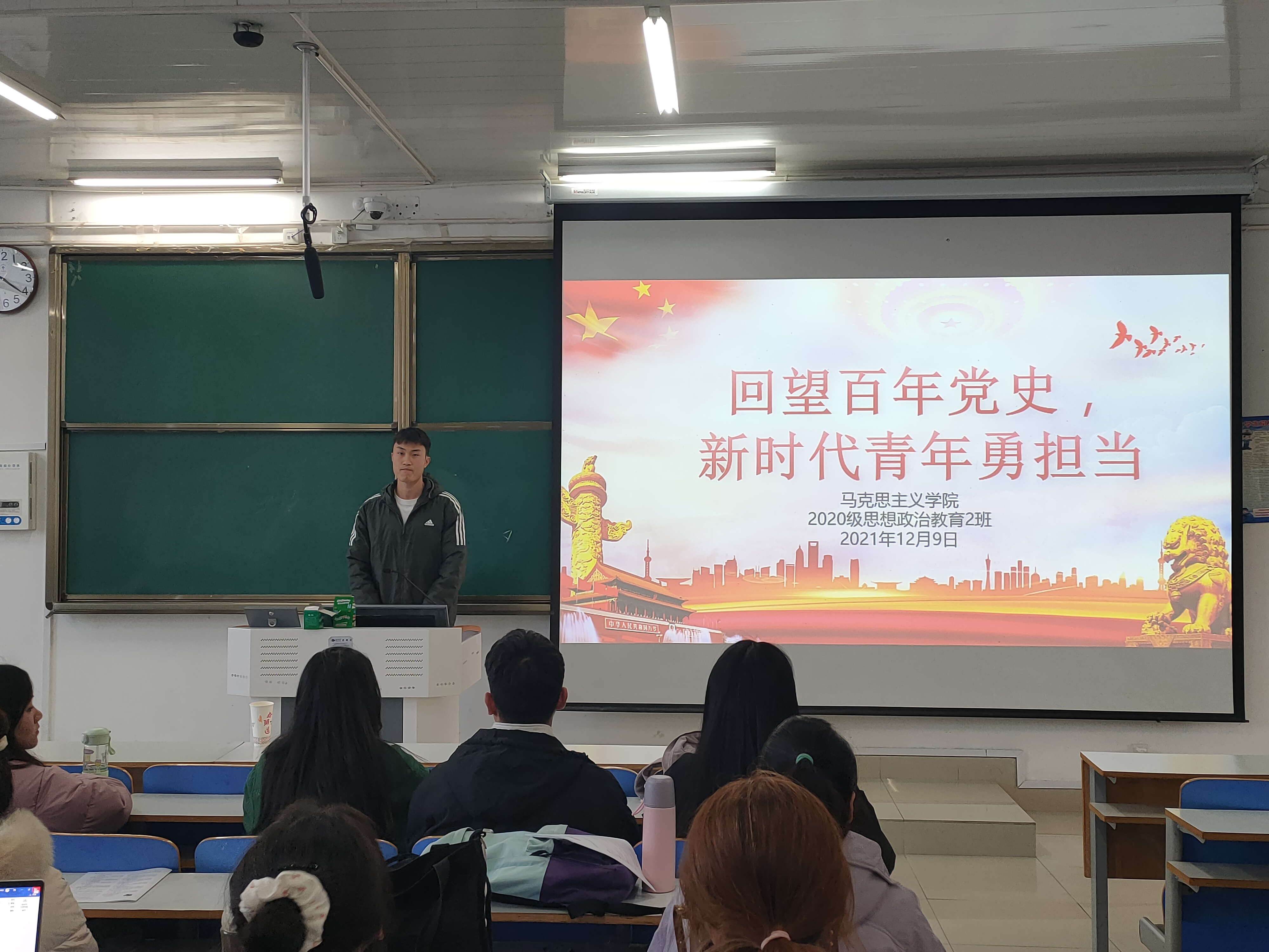 12月9日下午,2020级思想政治教育二班、定向二班在社科楼514教室开展“回望百年党史,新时代青年勇担当”主题团课。2020级思想政治教育二班、定向二班全体团员共同参与本次团课。团课由团支书陈宇航讲授。