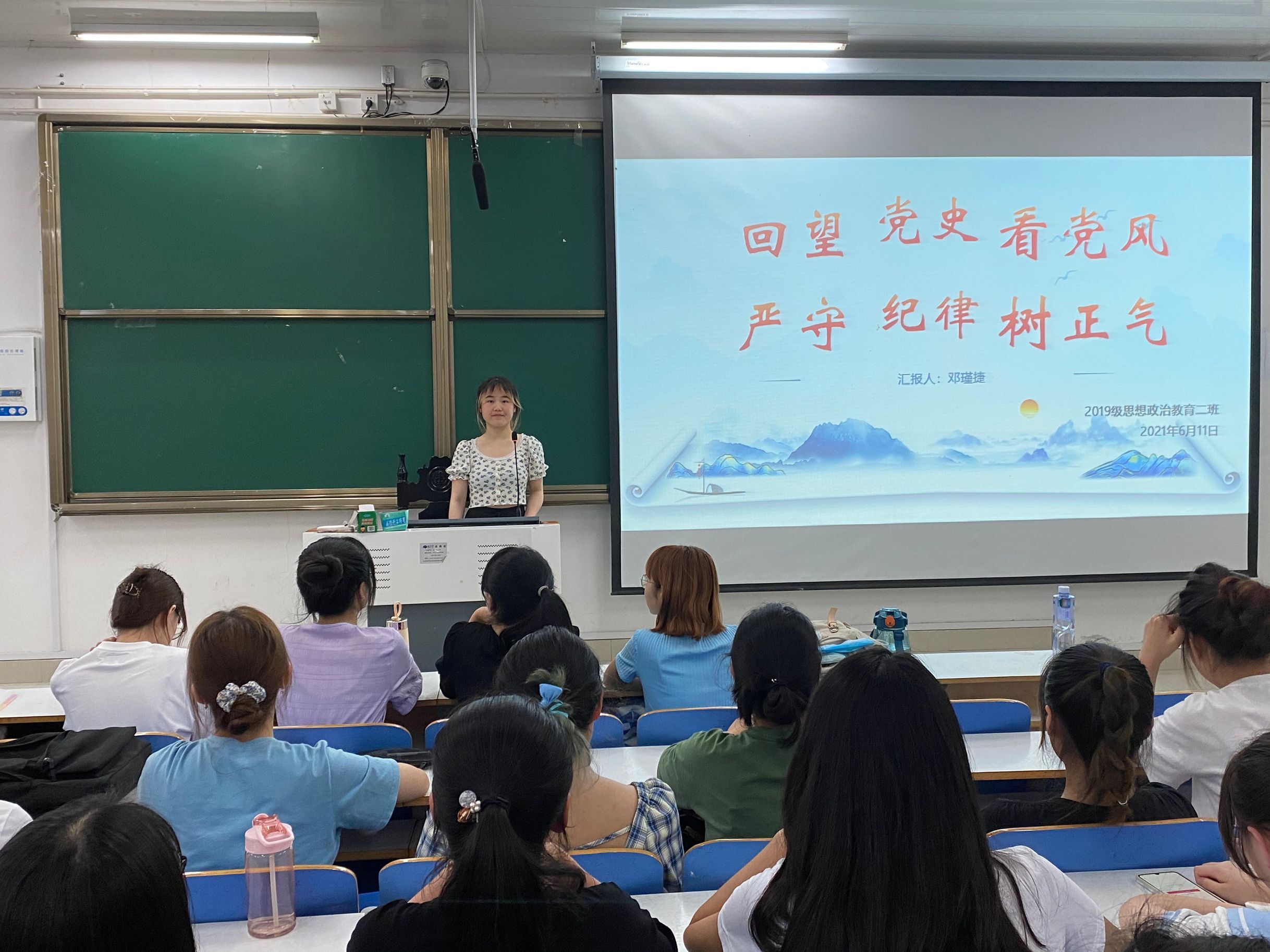 每一次历史回眸,都是一次精神洗礼;每一次党性教育,都是一次自我革命。6月11日上午,公司2019级思想政治教育二班于社科楼516教室召开“回望党史看党风 严守纪律树正气”党史教育主题团课。2019级思想政治教育二班全体成员共同参会。会议由文体委员邓瑾捷主持。