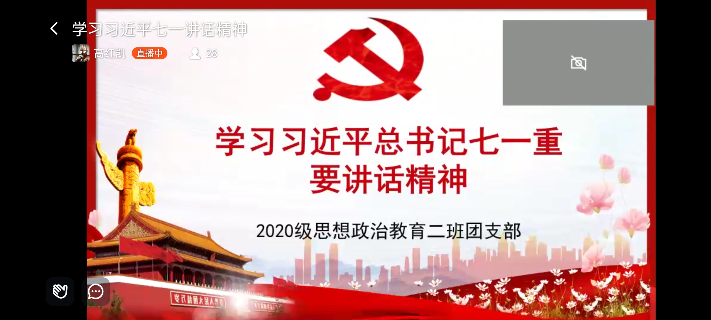 为促使我班团员深入领会习近平总书记“七一”重要讲话精神,感悟百年沧桑巨变、明确自身使命担当,8月12日下午,2020级思想政治教育定向二班团支部学习习近平总书记“七一”重要讲话精神主题线上团日活动通过钉钉直播顺利开展。定向二班团支部全体团员参与本次活动。活动由班长高红凯主持。