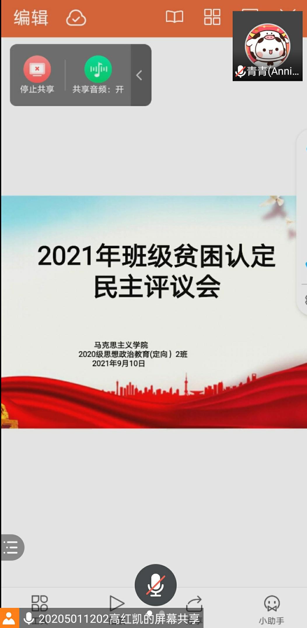 9月10日上午,2020级思想政治教育定向二班2021年班级贫困认定线上民主评议会通过腾讯会议顺利开展。班主任陶青青出席会议,评议小组全体成员按时到会,公司权益保障部监督员宋佳怡全程监督。评议会由班长高红凯主持。