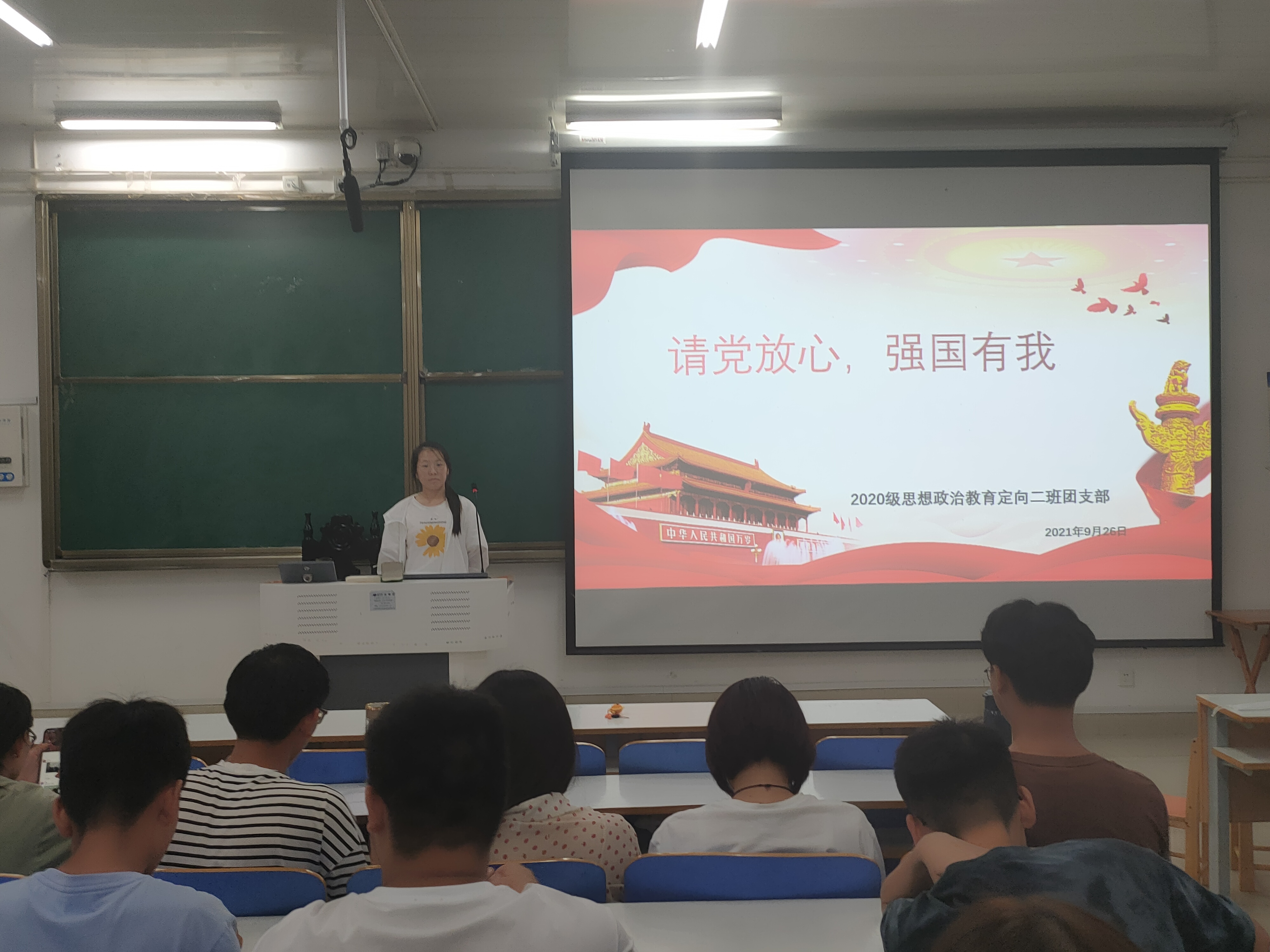 9月26日晚上,2020级思想政治教育二班、定向二班在社科楼514教室顺利开展“请党放心,强国有我”主题团课。二班、定向二班全体团员共同参加本次团课,团课由孙晶晶、黄敏主持。