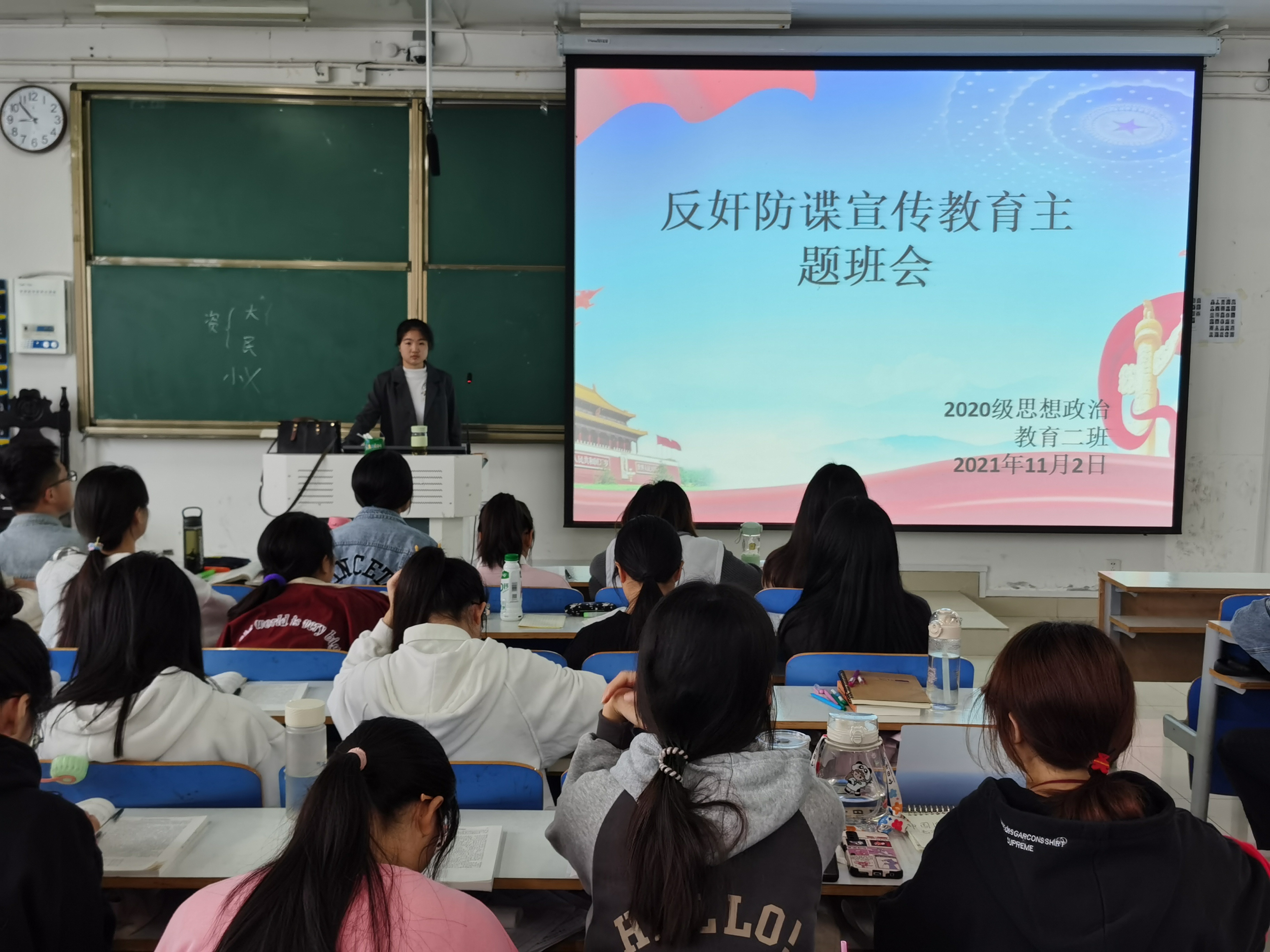 为进一步增强同学们的国家安全意识,11月2日上午,2020级思想政治教育二班、定向二班在社科楼516教室召开“反奸防谍”宣传教育主题班会。2020级思想政治教育二班、定向二班全体同学共同参与本次班会。班会由副班长孙雪主持。