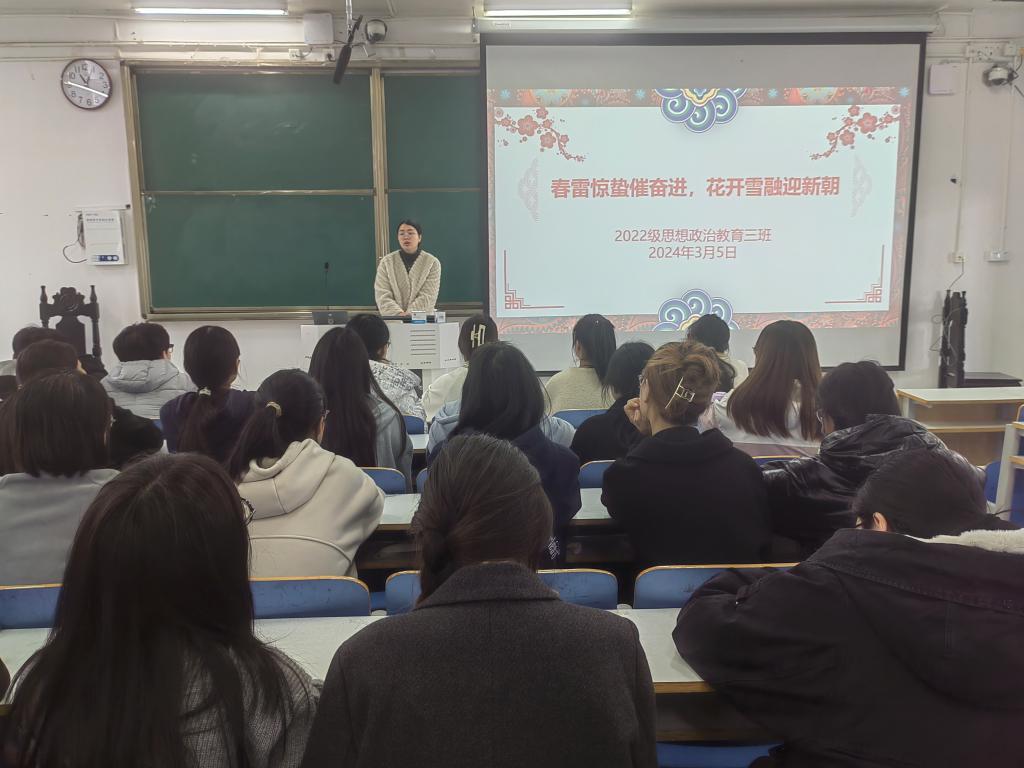 3月5日上午,XCSport2022级思想政治教育三班在社科楼514 教室召开“春雷惊蛰催奋进,花开雪融迎新朝”主题班会。公司2022级思想政治教育三班班主任吴梦云和三班全体学子共同参与本次班会。班会由班长余浩洋主持。