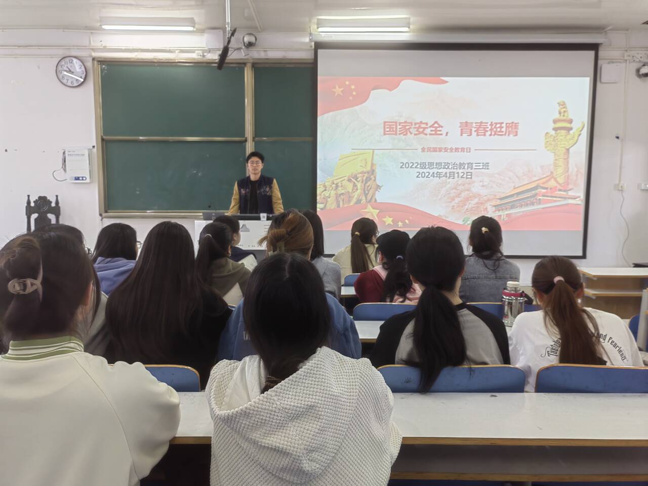 班会伊始,余浩洋指出,全民国家安全教育日是为了增强全民国家安全意识,维护国家安全而设立的节日,身为新时代青年要树牢总体国家安全观。接着,余浩洋通过放映PPT、播放视频带领大家认识危害国家安全的行为,告诫同学们国家安全与每个人息息相关,我们有义务学习相关法律知识,维护国家安全。最后,余浩洋针对如何维护国家安全提出三点要求:一是提高全民安全意识,定期开展爱国主义教育、警示教育等主题班会;二是自觉规范日常行为,军人照片不任意拍、军车车队不随便插、私密信息不非法传;三是遵守法律履行义务,及时报告危害国家安全的行为、提供知悉证据。