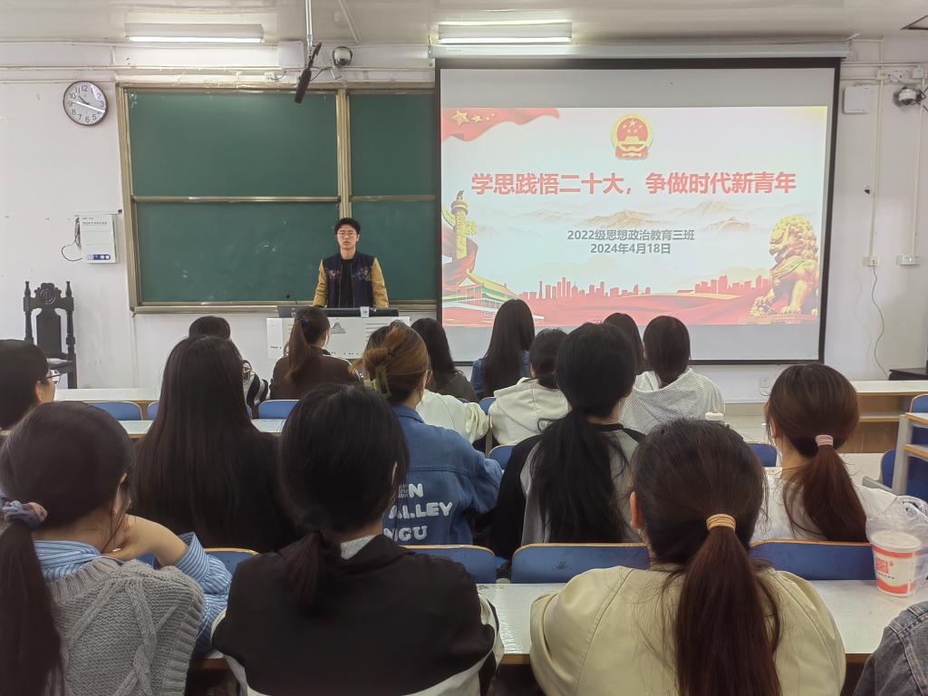 学习新思想,迈进新征程。为全面学习贯彻党的二十大会议精神,4月18日上午,2022级思想政治教育三班在社科楼514教室召开“学思践悟二十大,争做时代新青年”主题团课。2022级思想政治教育三班全体成员共同参与团课,团课由团支书余浩洋主持。