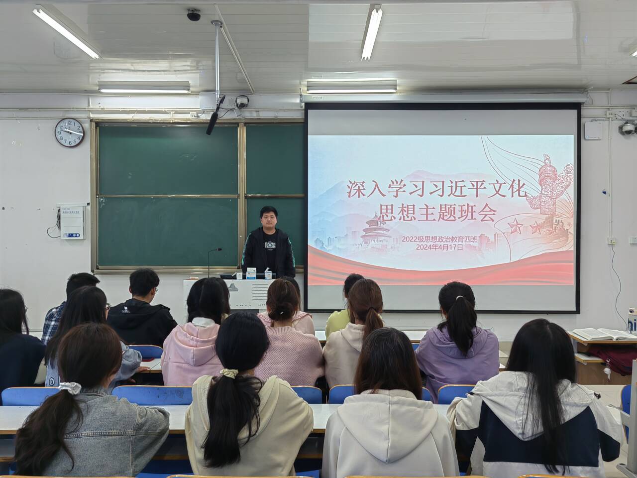为深入学习贯彻习近平文化思想,引导广大青年学子勇担强国使命,矢志文化报国,4月17日上午,XCSport2022级思想政治教育四班在社科楼514教室组织召开“深入学习习近平文化思想”主题班会。公司2022级思想政治教育四班全体成员参与本次班会。本次班会由副班长宋奕铭主持。