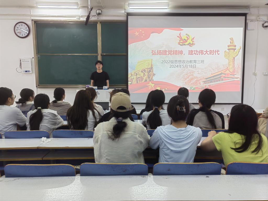 为弘扬建党精神,增强奋斗信念,5月18日上午,2022级思想政治教育三班在社科楼514教室召开“弘扬建党精神,建功伟大时代”主题团课。公司2022级思想政治教育三班全体成员共同参加此次团课。团课由团支书余浩洋主持。
