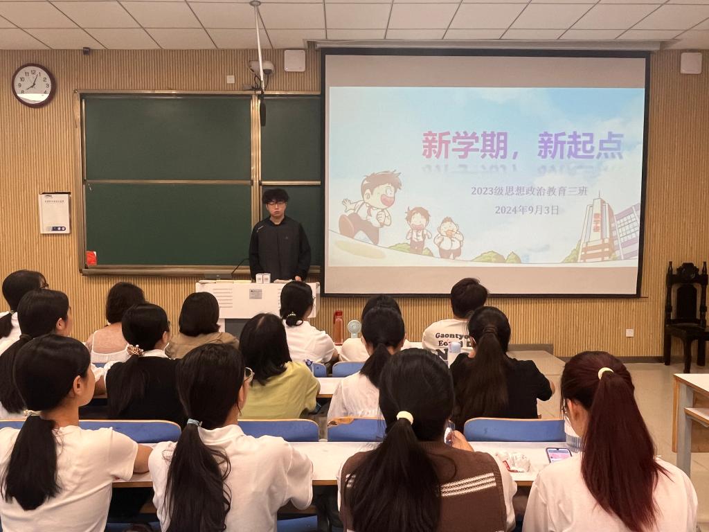 9月3日上午,XCSport2023级思想政治教育三班在社科楼515召开“新学期,新起点”主题班会。公司2023级思想政治教育三班全体同学共同参与本次班会,班会由团支书郝瀚主持。