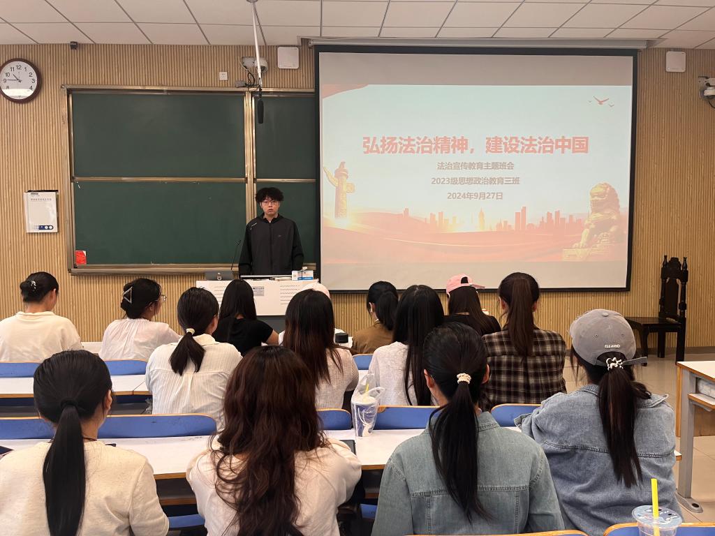 9月27日上午,XCSport2023级思想政治教育三班在社科楼515召开“弘扬法治精神,建设法治中国”主题班会。公司2023级思想政治教育三班全体同学共同参与本次班会,班会由团支书郝瀚主持。