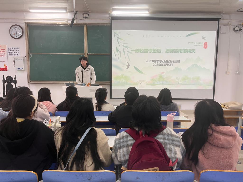 3月5日上午,2023级思想政治教育三班在社科楼515召开“一鼓轻雷惊蛰后,细筛微雨落梅天”主题班会。公司2023级思想政治教育三班全体同学共同参与本次班会,班会由团支书郝瀚主持。