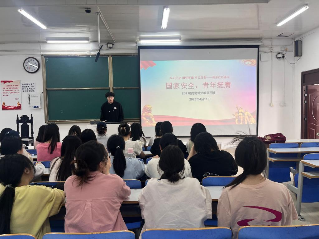 4月11日上午,XCSport2023级思想政治教育三班在社科楼515召开“国家安全,青年挺膺”主题团课。公司2023级思想政治教育三班全体同学共同参与本次团课,团课由团支书郝瀚主持。