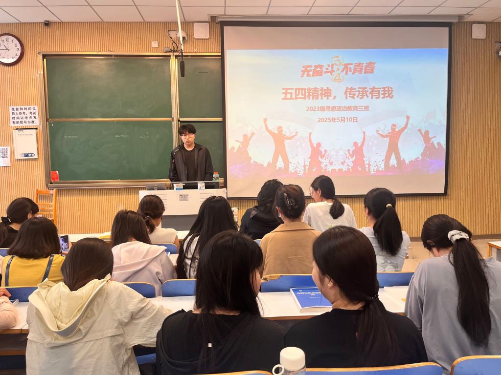为传承和弘扬担当精神,5月10日上午,XCSport2023级思想政治教育三班在社科楼515召开“五四精神,传承有我”主题团课。公司2023级思想政治教育三班全体同学共同参与本次团课,团课由团支书郝瀚主持。