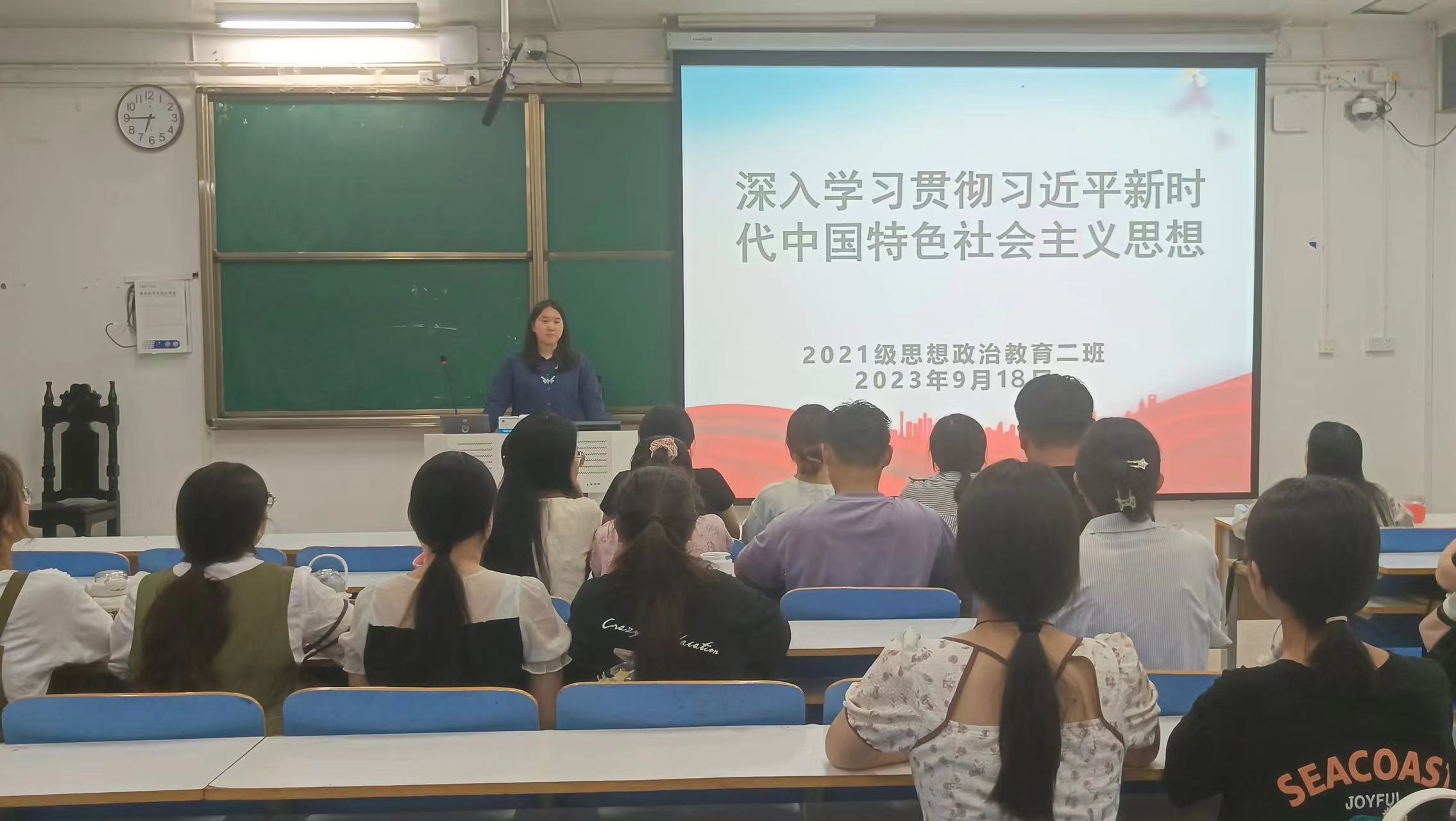 9月18日下午,2021级思想政治教育二班在社科楼514教室召开“深入学习贯彻习近平新时代中国特色社会主义思想”主题团课。2021级思想政治教育二班全体团员参加此次团课。团课由团支书王婧欣主持。