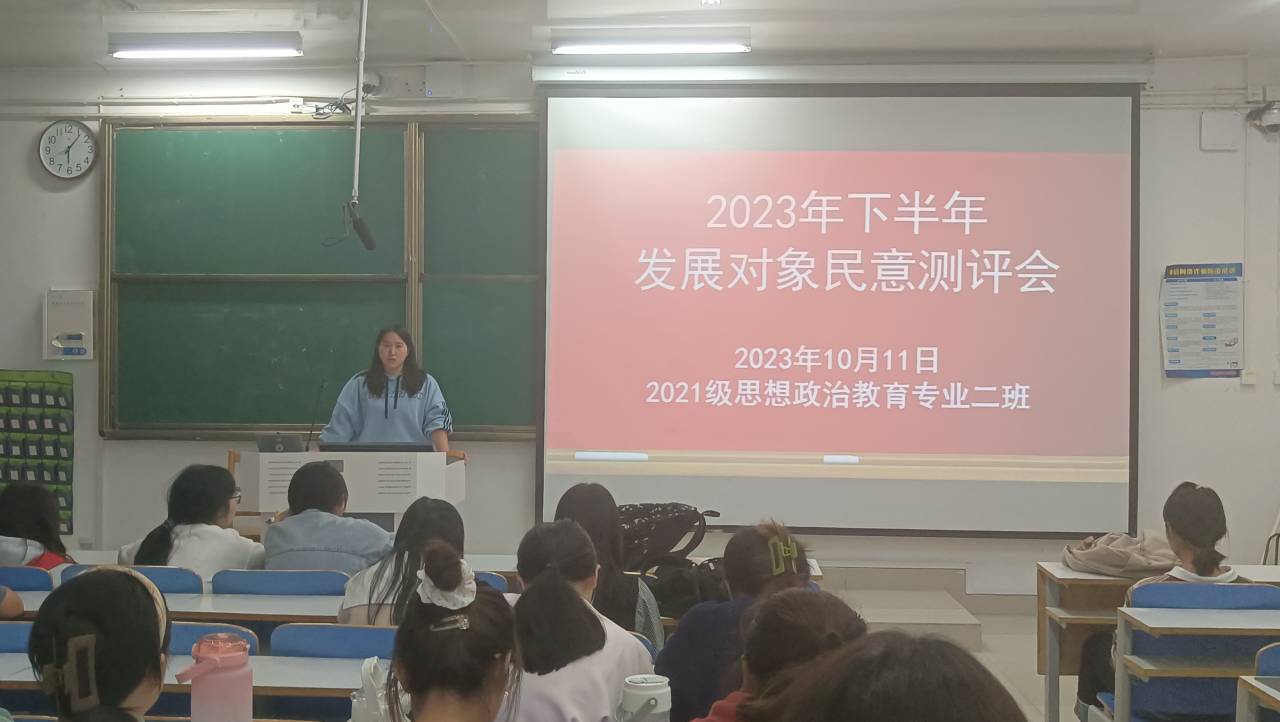 10月11日下午,2021级思想政治教育二班在社科楼517教室召开2023年下半年发展对象民意测评会。2021级思想政治教育二班全体成员参加本次民意测评会。会议由团支书王婧欣主持。