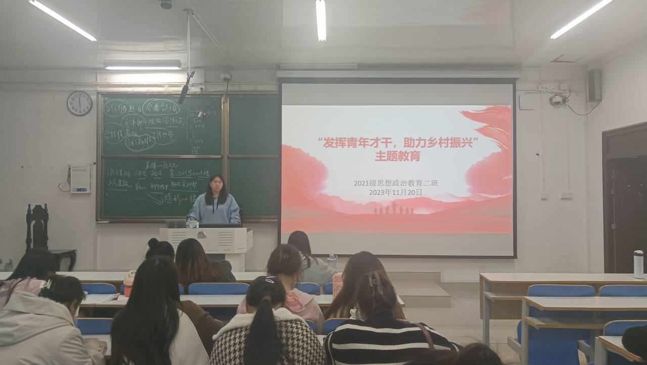 11月20日下午,2021级思想政治教育二班在社科楼514教室召开“发挥青年才干,助力乡村振兴”主题团课。2021级思想政治教育二班全体团员参加此次团课。团课由团支书王婧欣主持。