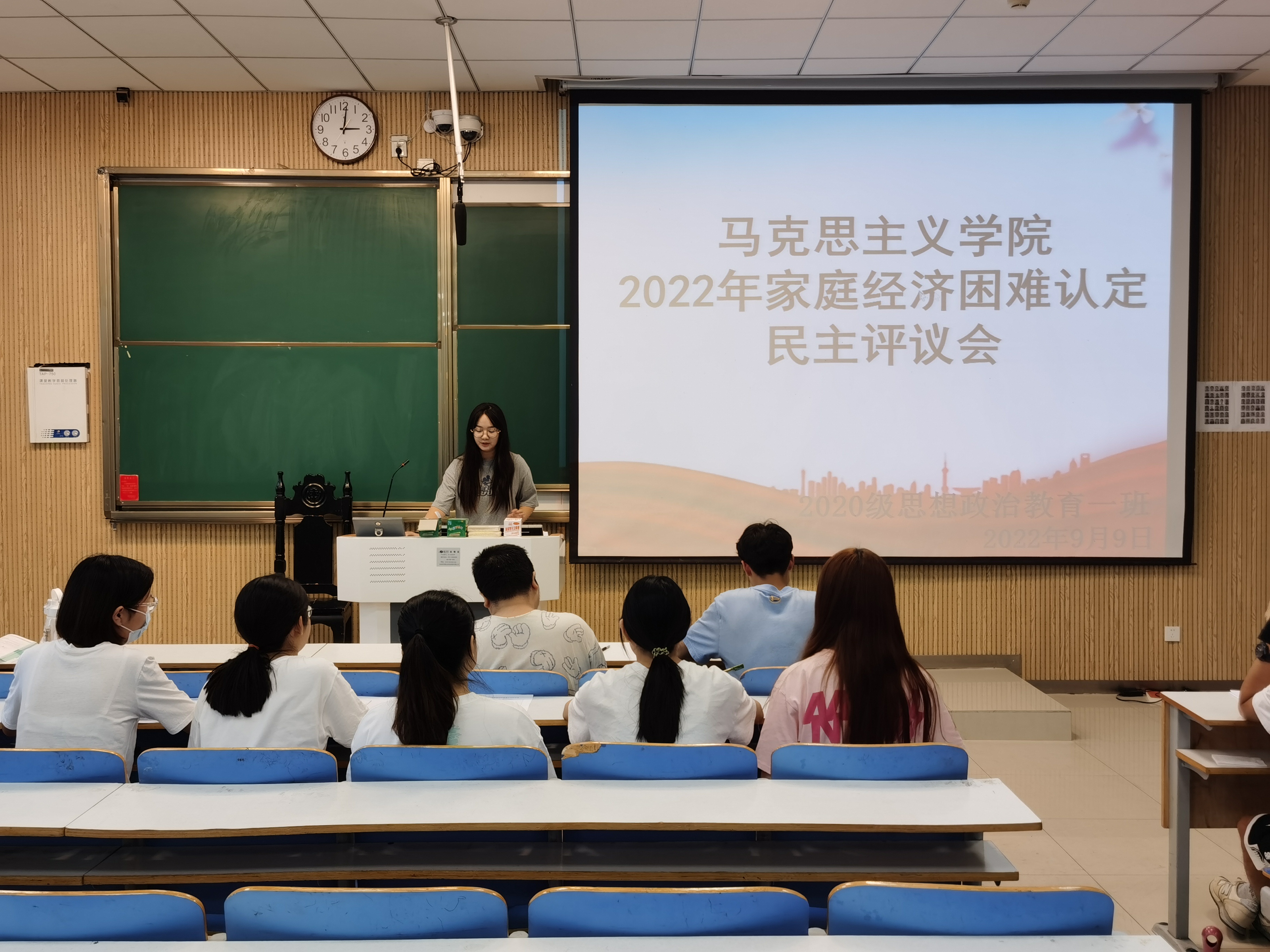 为做好家庭经济困难员工的认定工作,9月9日下午,2020级思想政治教育一班在社科楼515教室召开2022年班级贫困认定民主评议会。评议小组成员、申请人及监督人参与了本次会议。会议由团支书卢茜雨主持。
