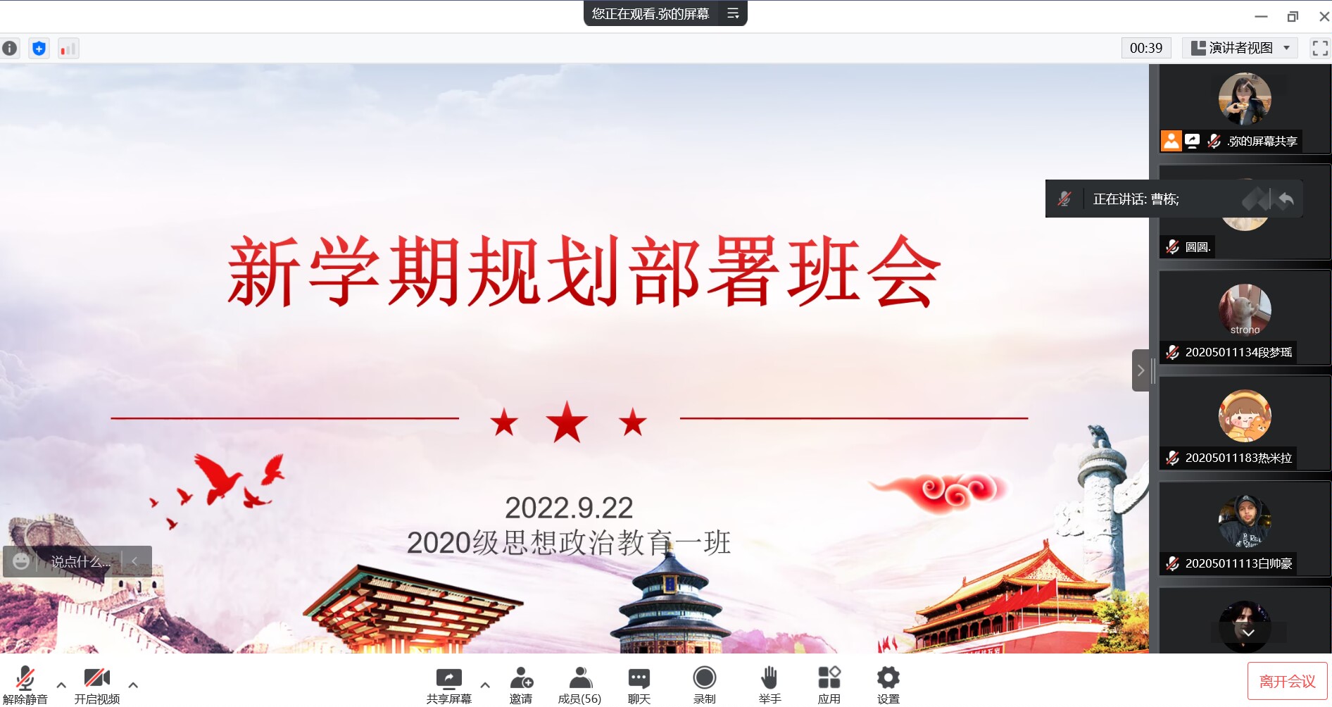 9月22日下午,2020级思想政治教育一班在腾讯会议上召开新学期规划部署班会。2020级思想政治教育一班全体同学及班主任曹栋共同参加此次班会。班会由曹栋主持。