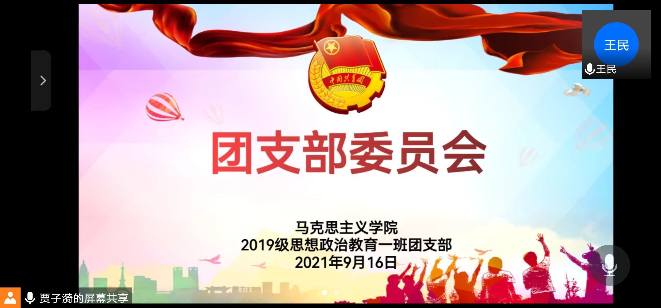 9月16日上午,2019级思想政治教育一班在腾讯视频召开团支部委员会。2019级思想政治教育一班团支委全体成员参加本次会议。会议由副班长王民主持。