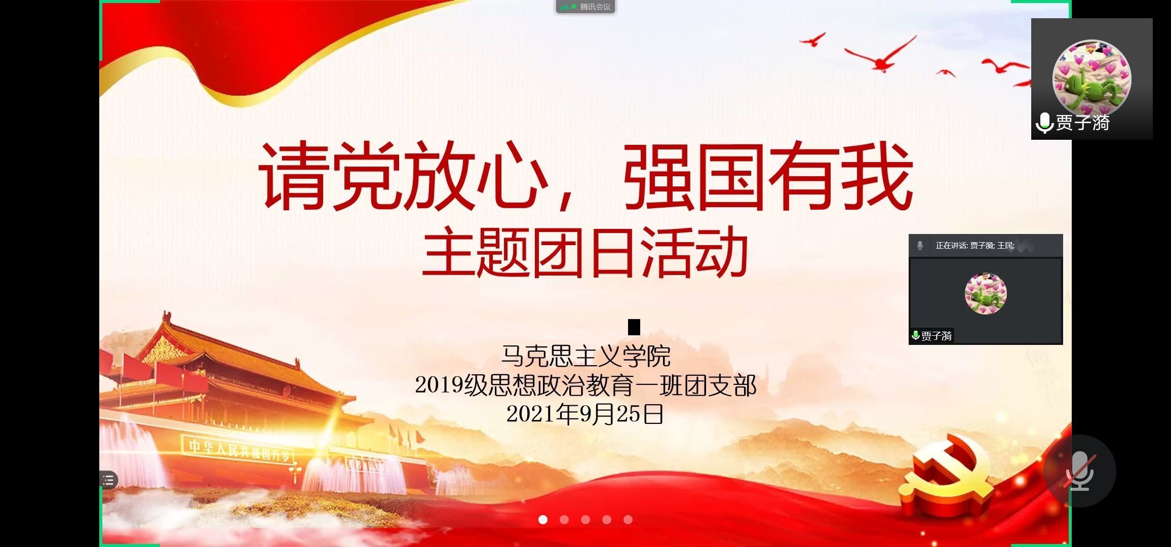 9月25日下午,2019级思想政治教育一班第一团支部在腾讯视频举办“请党放心,强国有我”主题团日活动。2019级思想政治教育一班全体团员参加本次活动。活动由团支书贾子漪主持。