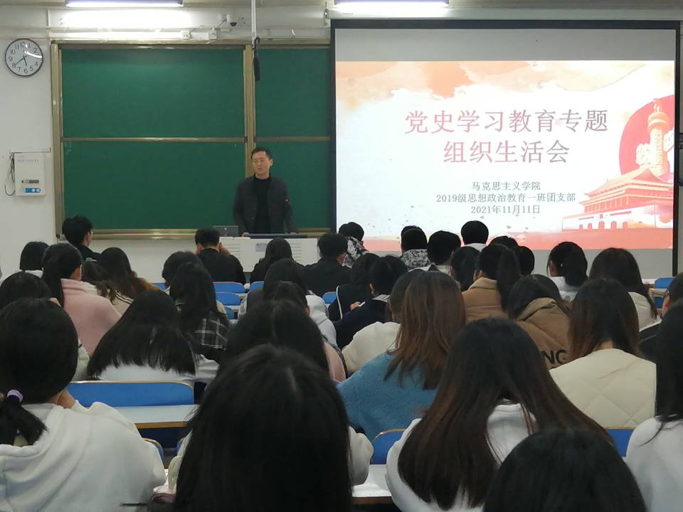 11月11日上午,2019级思想政治教育一班第一团支部在社科楼516教室召开党史学习教育专题组织生活会。2019级思想政治教育一班全体成员参加本次会议,会议由班长贾子漪主持。
