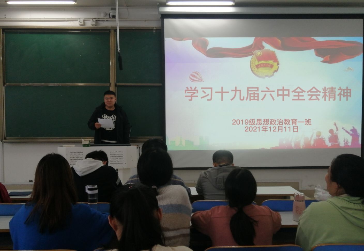 12月11日上午,2019级思想政治教育一班第一团支部在社科楼516教室召开“学习党的十九届六中全会精神”主题团课。2019级思想政治教育一班团支部全体团员参加本次团课。团课由团支书贾子漪主持。