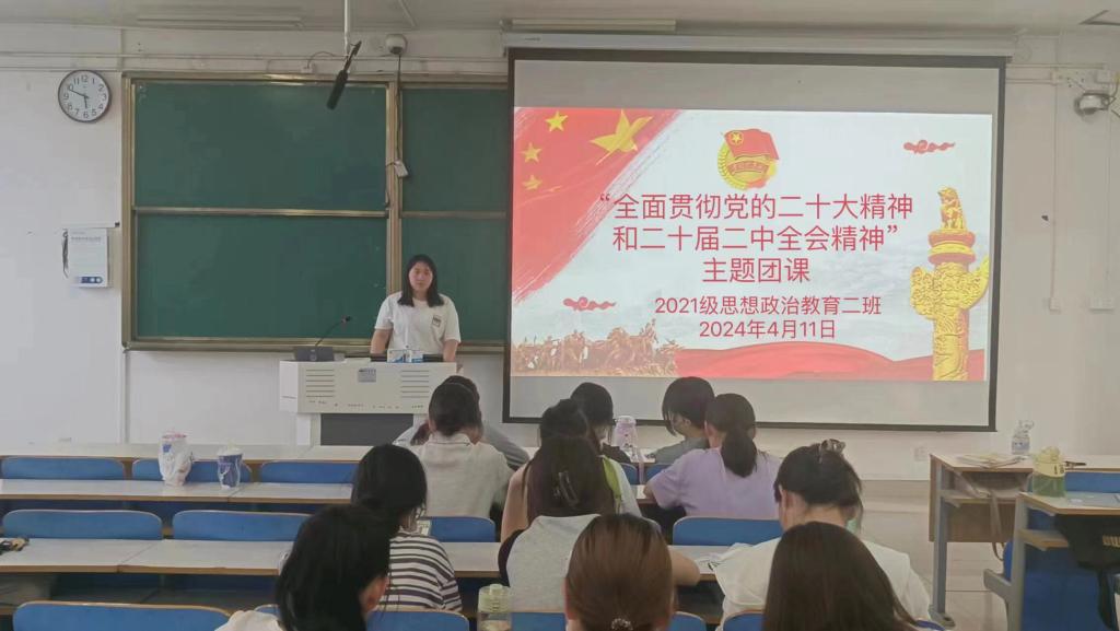 4月11日下午,2021级思想政治教育二班在社科楼514教室召开“全面贯彻党的二十大精神和二十届二中全会精神”主题团课。2021级思想政治教育二班全体团员参加此次团课。团课由团支书王婧欣主持。
