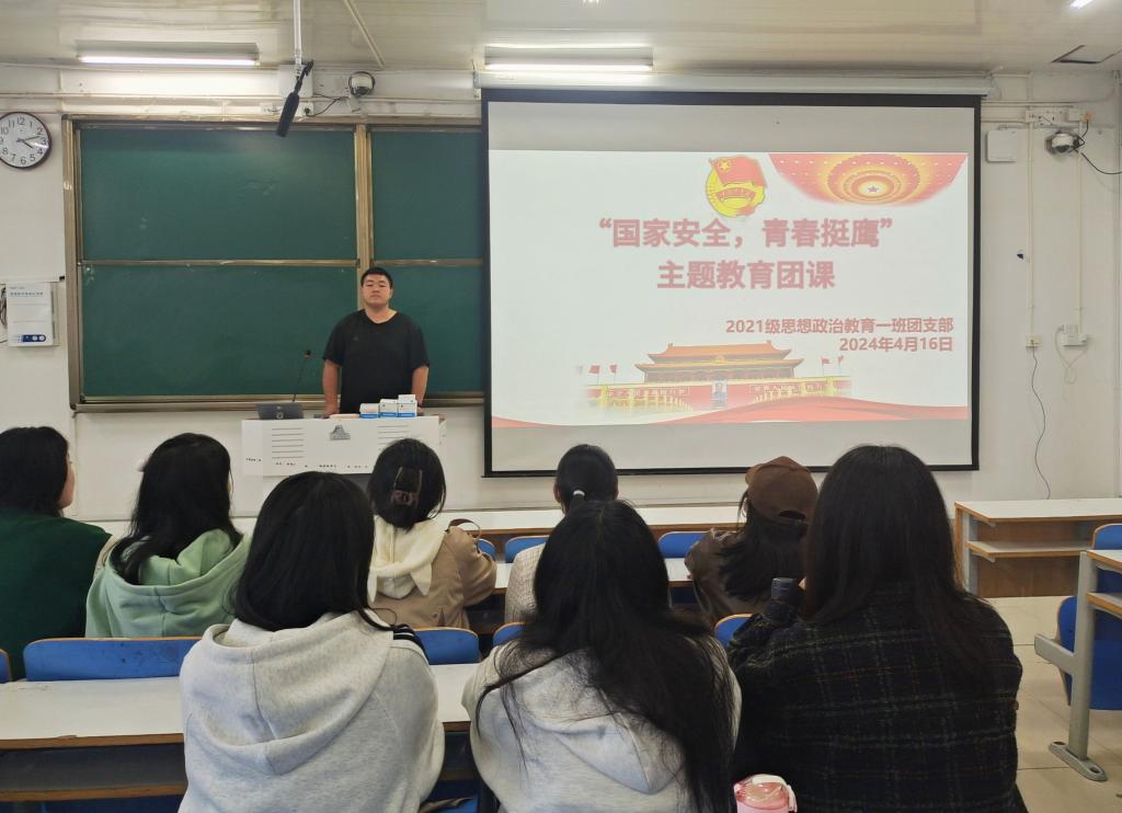 为深入贯彻总体国家安全观,进一步增强员工的国家安全意识,培养员工的爱国情怀,4月16日下午,XCSport2021级思想政治教育一班在社科楼514教室召开“国家安全,青春挺鹰”主题团课。2021级思想政治教育一班全体团员参加了本次团课。团课由团支书戴翰林主持。