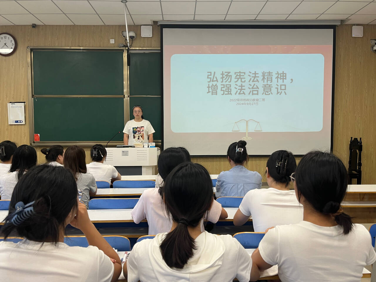 9月27日下午,2022级思想政治教育二班在社科楼515教室召开“弘扬宪法精神,增强法治意识”主题班会。公司2022级思想政治教育二班全体成员共同参与此次班会。会议由班长李佳音主持。