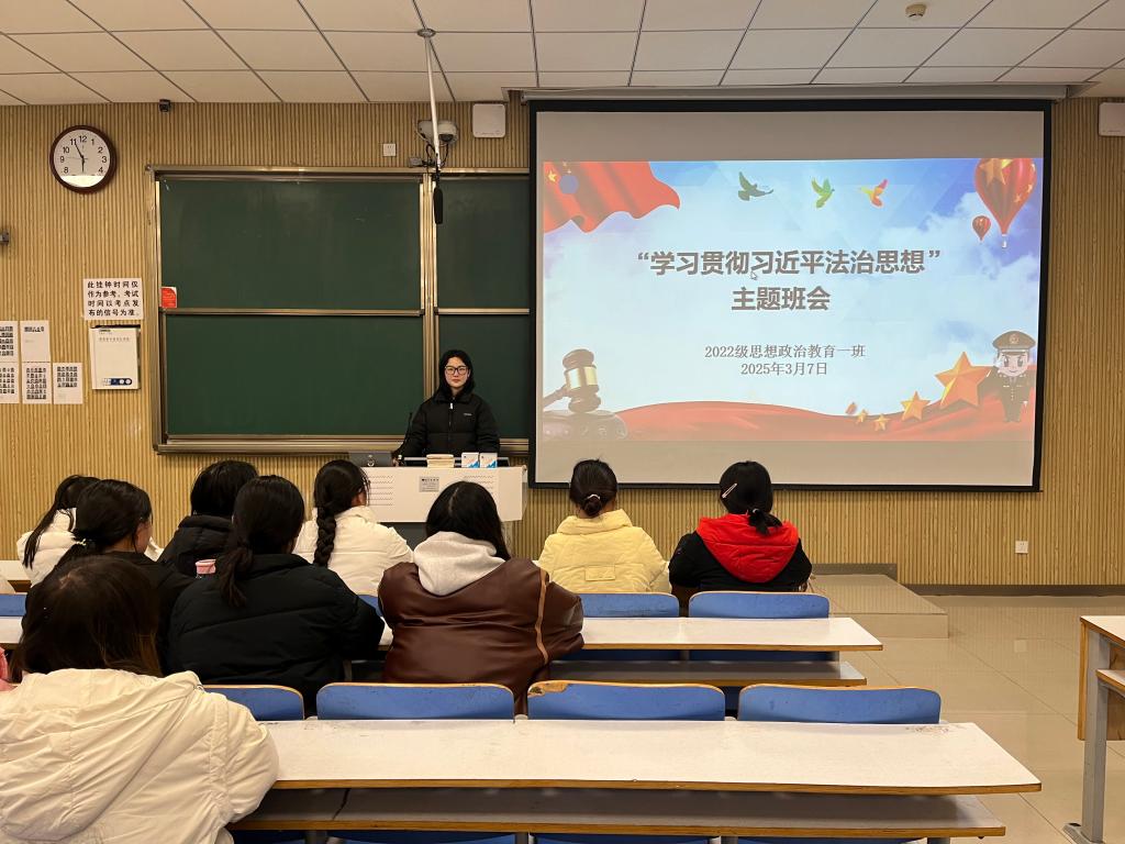 为深入学习贯彻习近平法治思想、全面贯彻党的二十大精神,切实推动学习贯彻习近平法治思想走深走实,3月7日下午,2022级思想政治教育一班在社科楼515教室开展“学习贯彻习近平法治思想”主题班会,公司2022级思想政治教育一班全体同学共同参与本次班会,班会由团支书李佳茹主持。