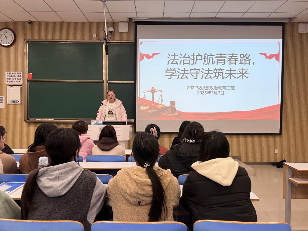 为增强老员工法治观念,筑牢校园安全防线,3月7日下午,2022级思想政治教育二班在社科楼515教室召开“法治护航青春路,学法守法筑未来”主题班会。公司2022级思想政治教育二班全体成员共同参与此次班会。会议由班长李佳音主持。